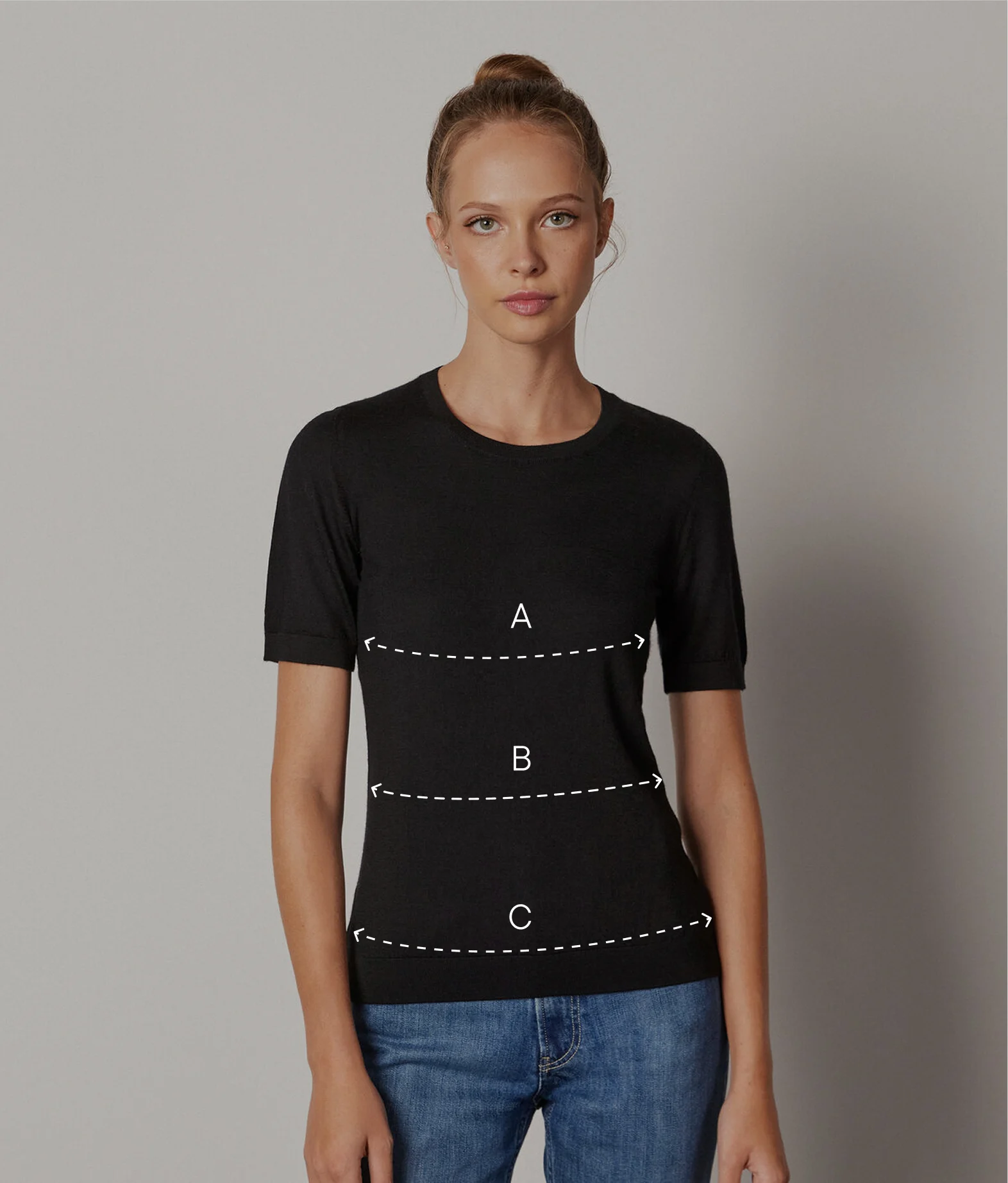 | Размер | А: Окружность груди | B: Окружность талии | C: Окружность бедер |