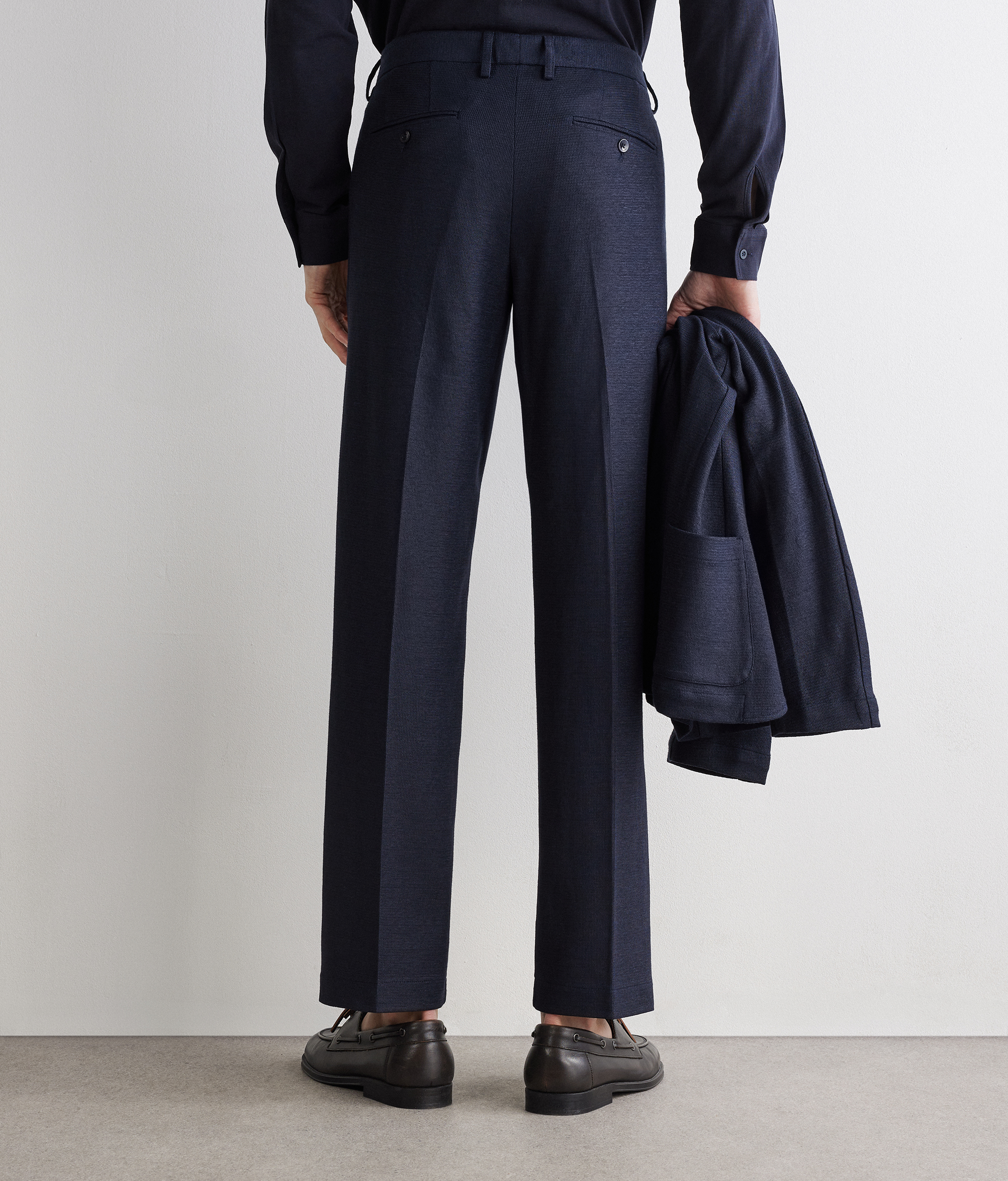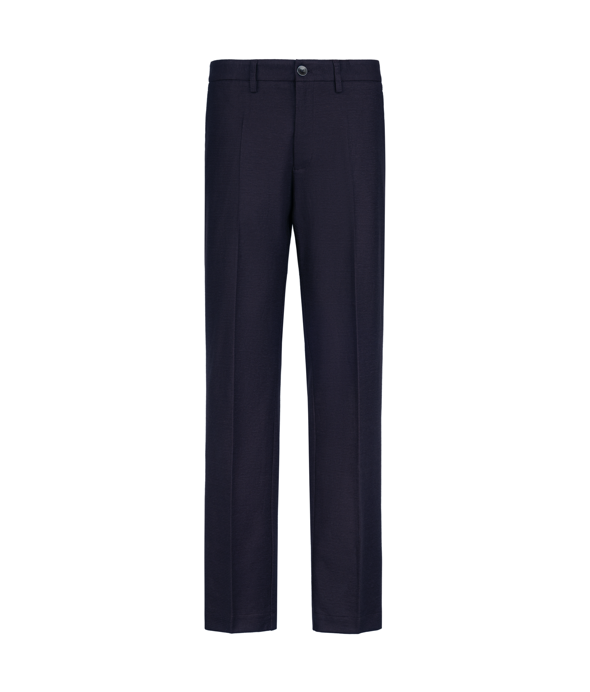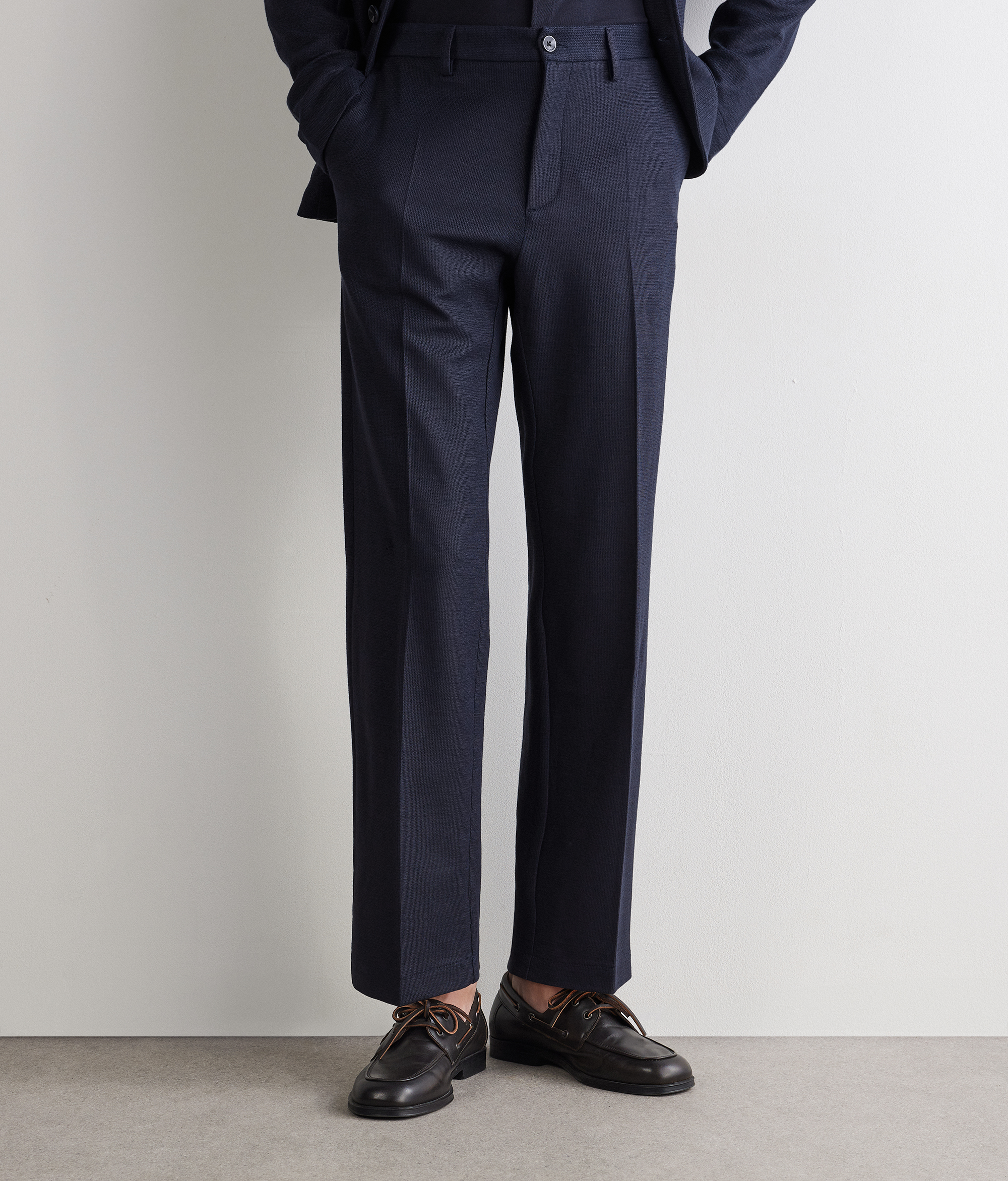 Модель с прямыми брючинами из ткани с вафельным узором на основе льна и хлопка делает акцент на текстуру, придающую оригинальность любому образу. Пояс со шлёвками и застёжка на молнию и пуговицу обеспечивают безупречную посадку. Французские карманы спереди и прорезные карманы с двойной листочкой на пуговице сзади являются изысканными и актуальными деталями.