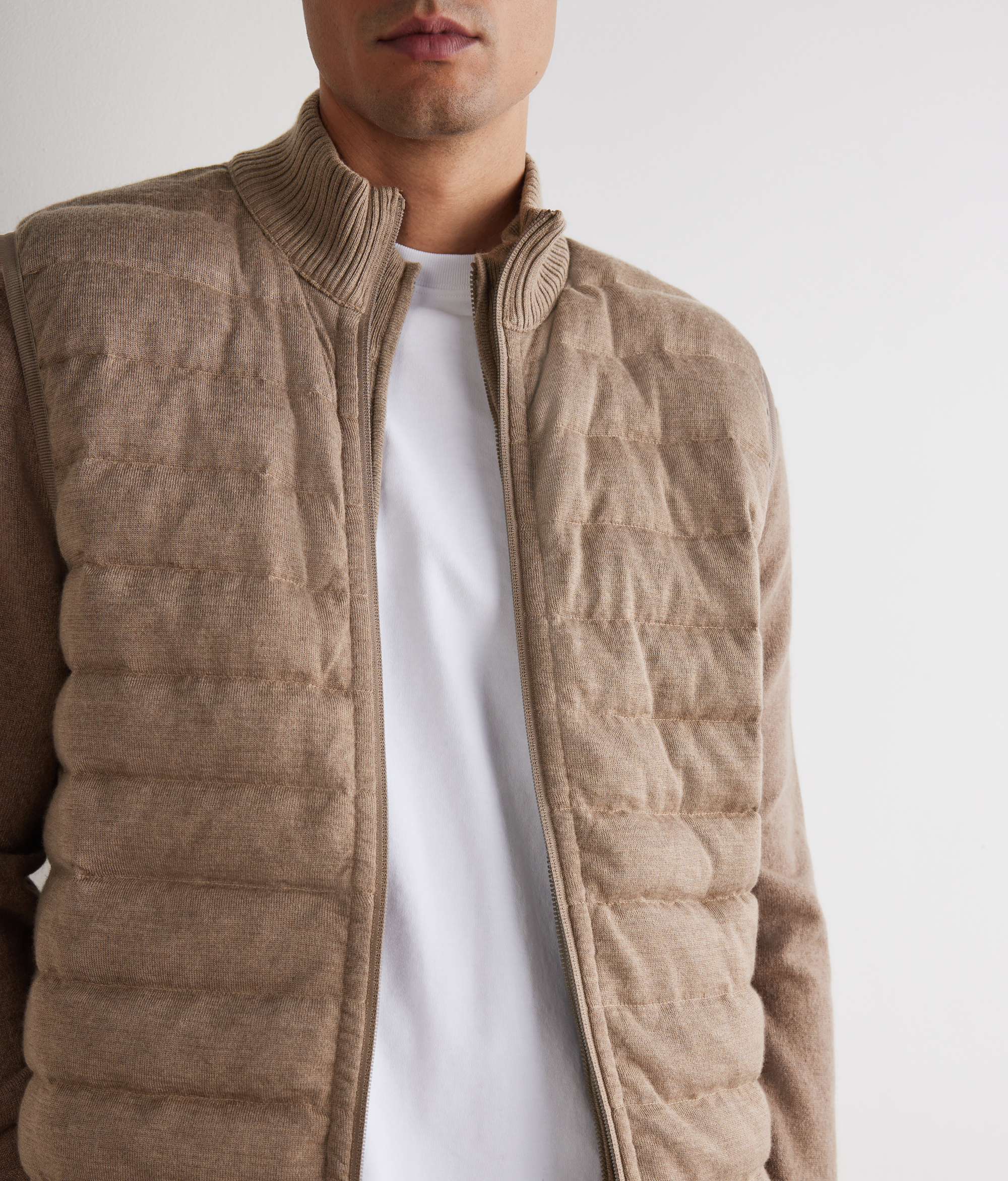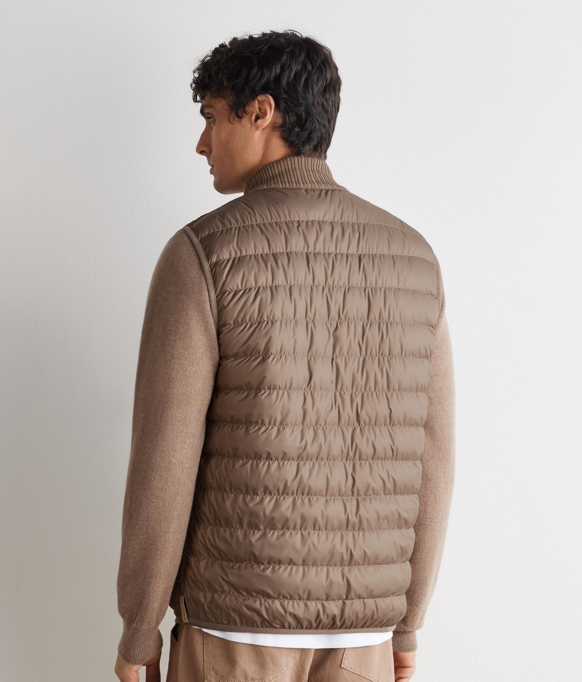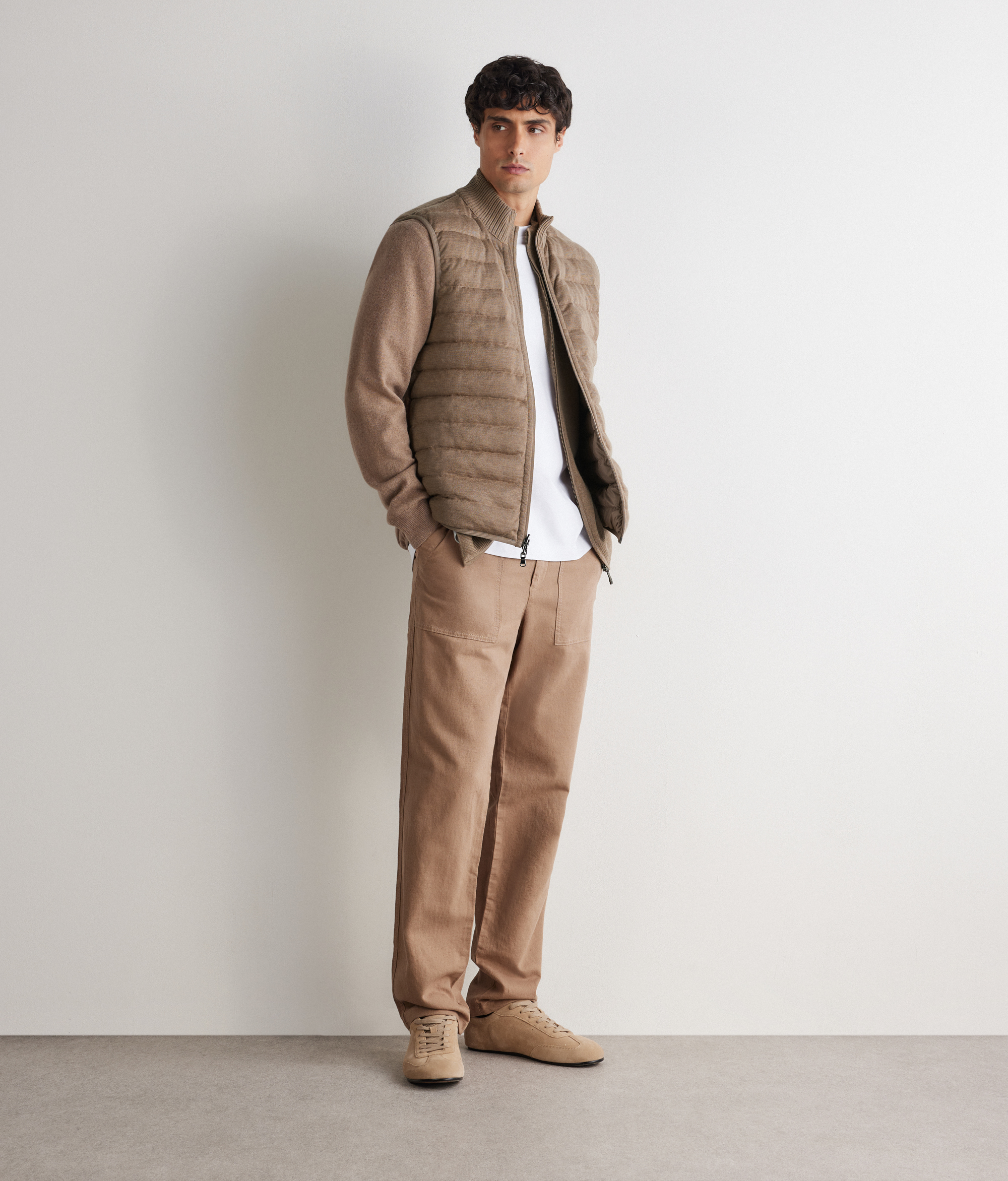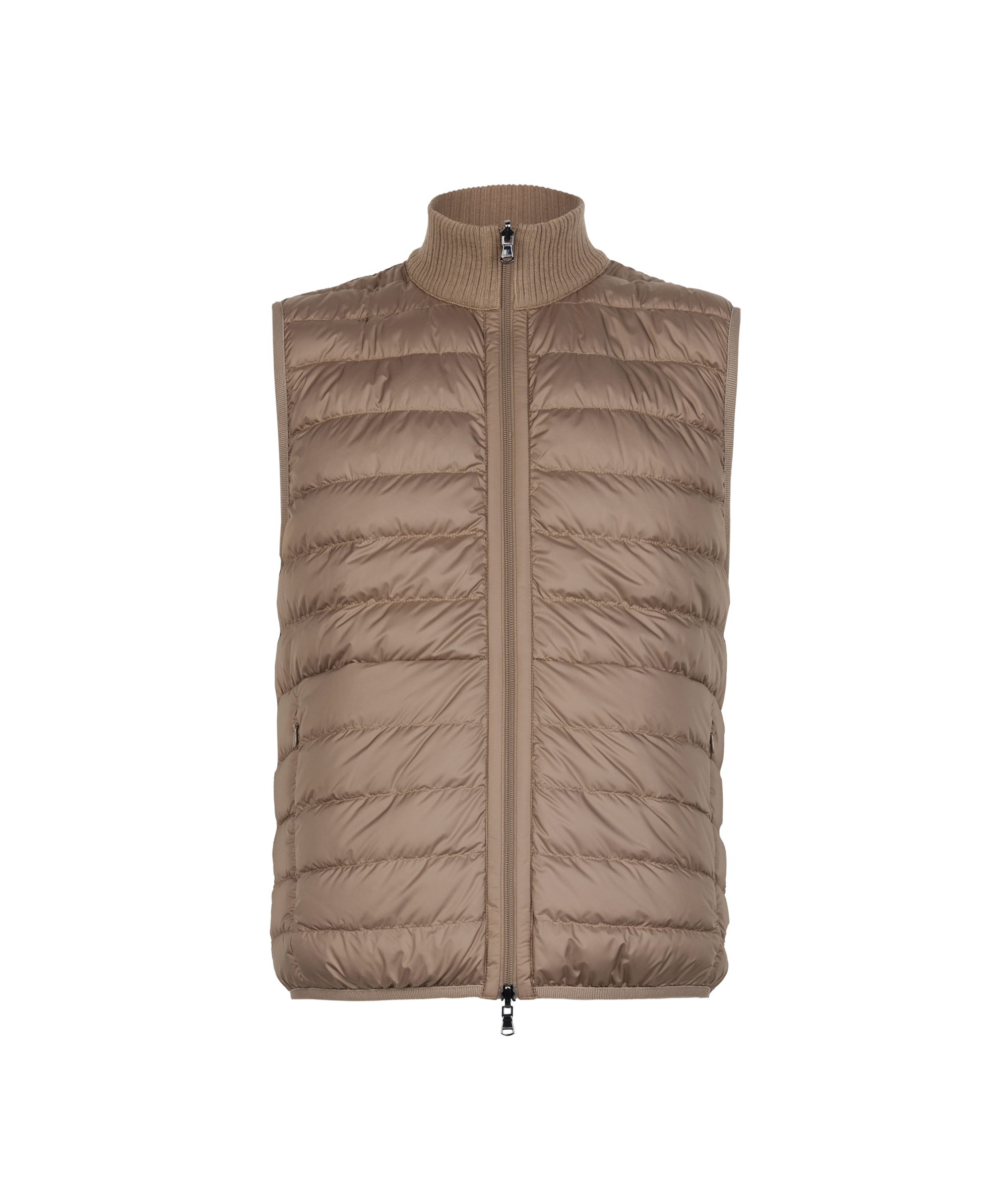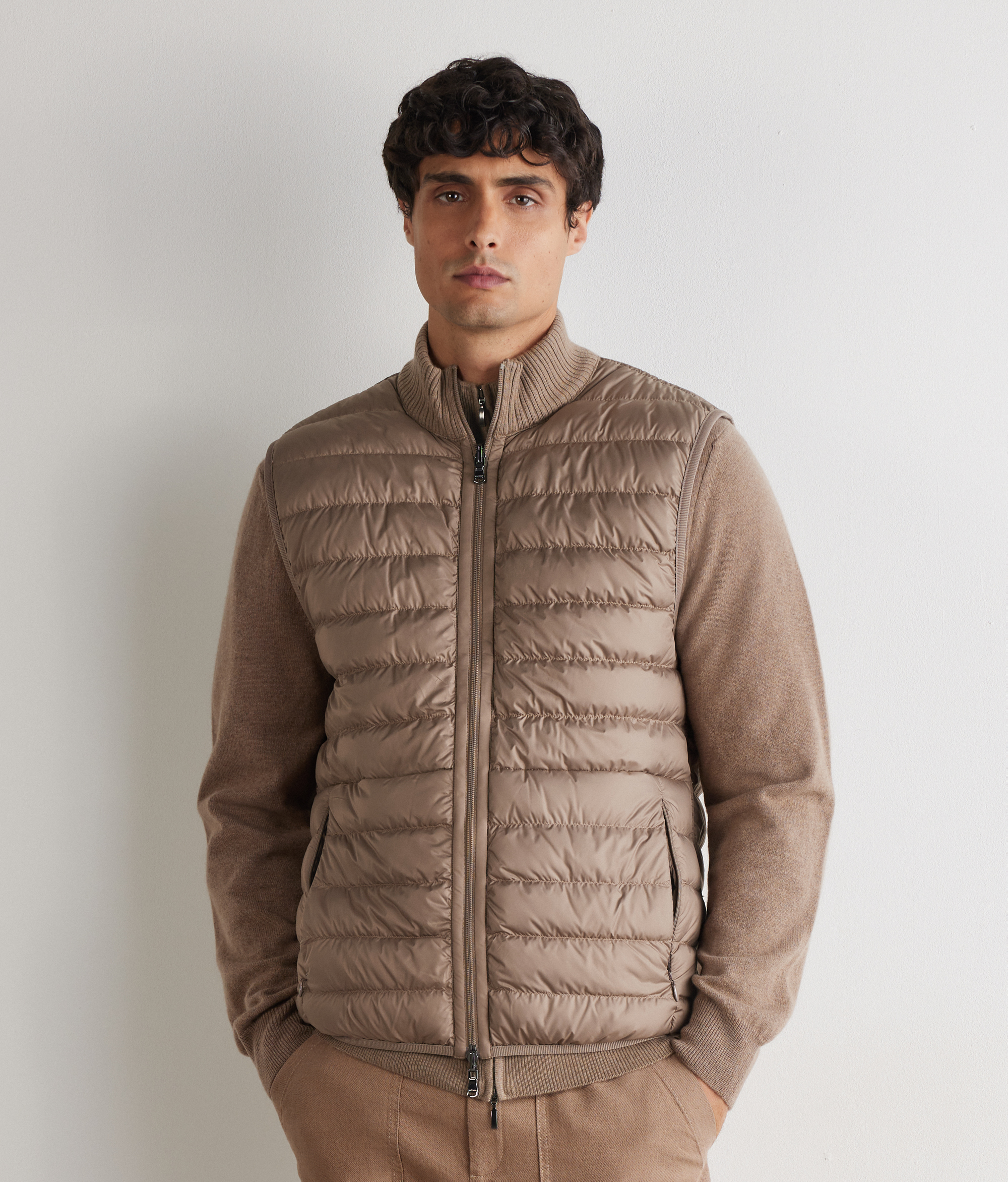 Двусторонний пуховый жилет идеально сочетает в себе функциональность и изысканность. Утончённый современный контраст: матовая техническая ткань на одной стороне и ультратонкий кашемир с плетёным узором на другой стороне. Высокий трикотажный воротник из кашемира, застёжка-молния с двумя бегунками и потайные карманы являются практичными и элегантными деталями. Отделка эластичной лентой завершает это универсальное изделие с облегающим силуэтом и изысканным дизайном.