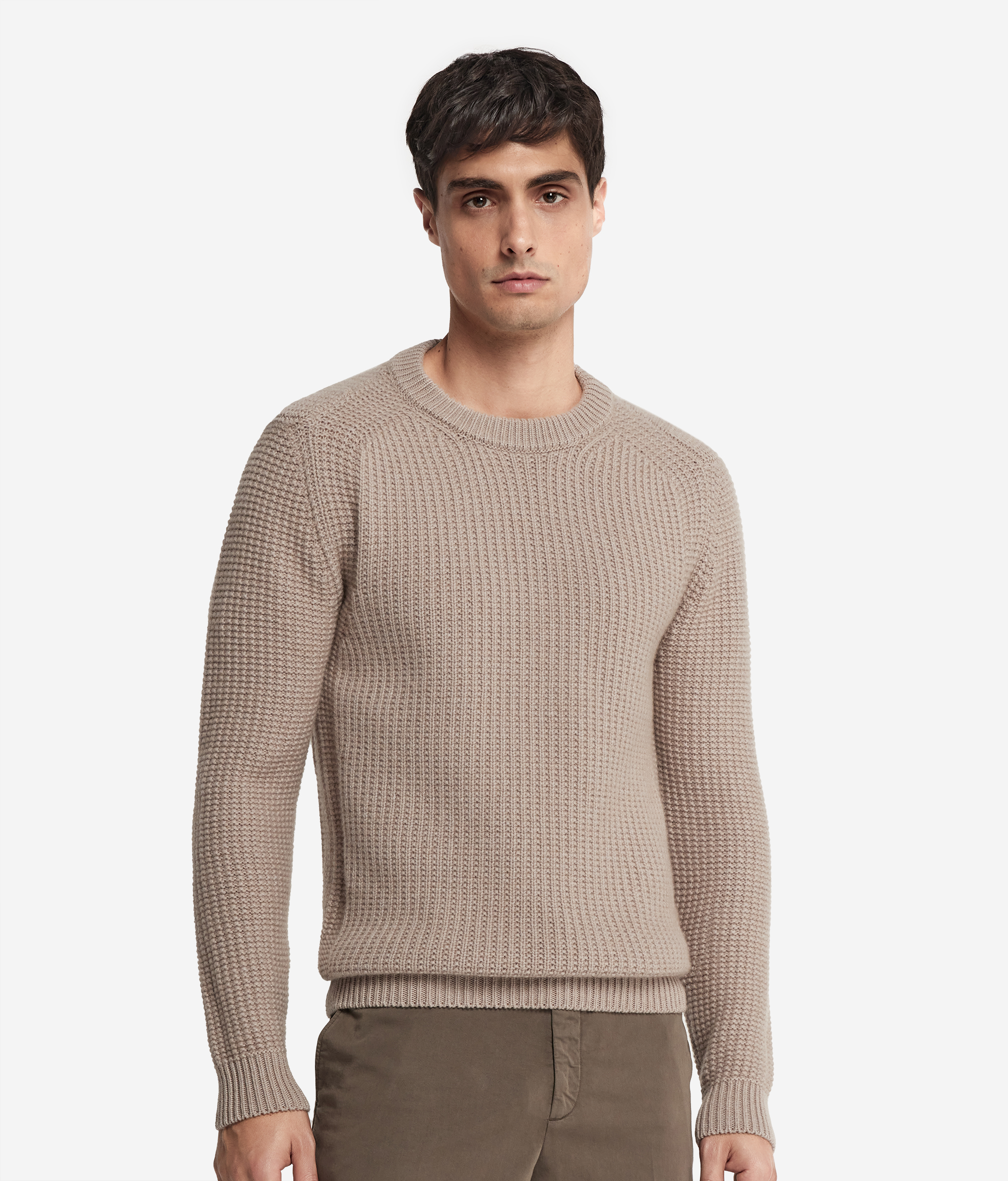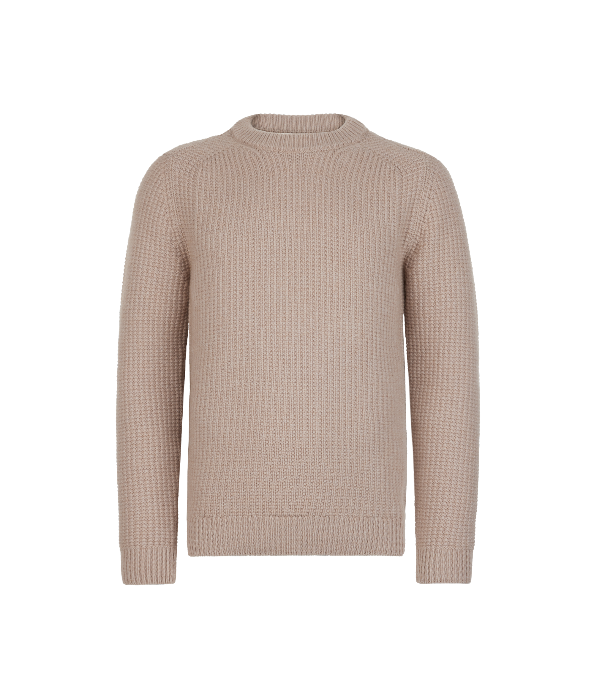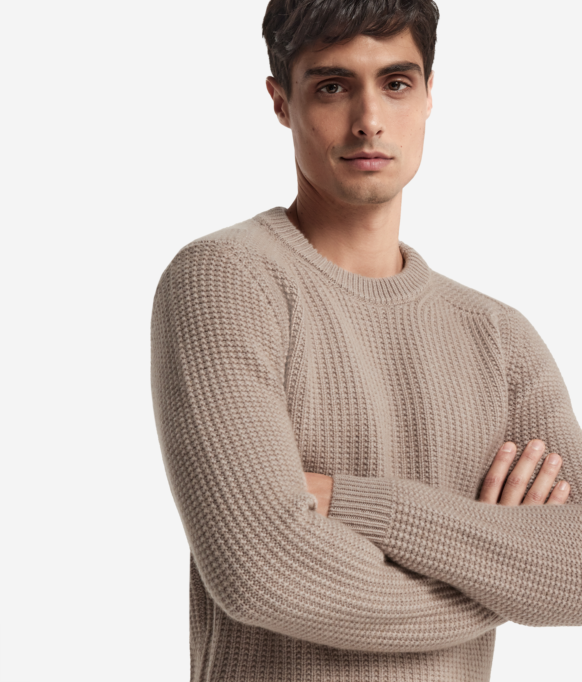 Этот джемпер с круглым вырезом горловины, изготовленный из ультрамягкого кашемира, соединяет в себе элегантность и непринуждённость. Изысканная отделка в рубчик и орнамент из узелков подчёркивают всё благородство ткани, создавая на её поверхности оригинальный трёхмерный эффект. Модель отличается продуманными деталями с выдвинутыми немного вперёд плечевыми швами, которые делают её крой ещё более современным и оригинальным.