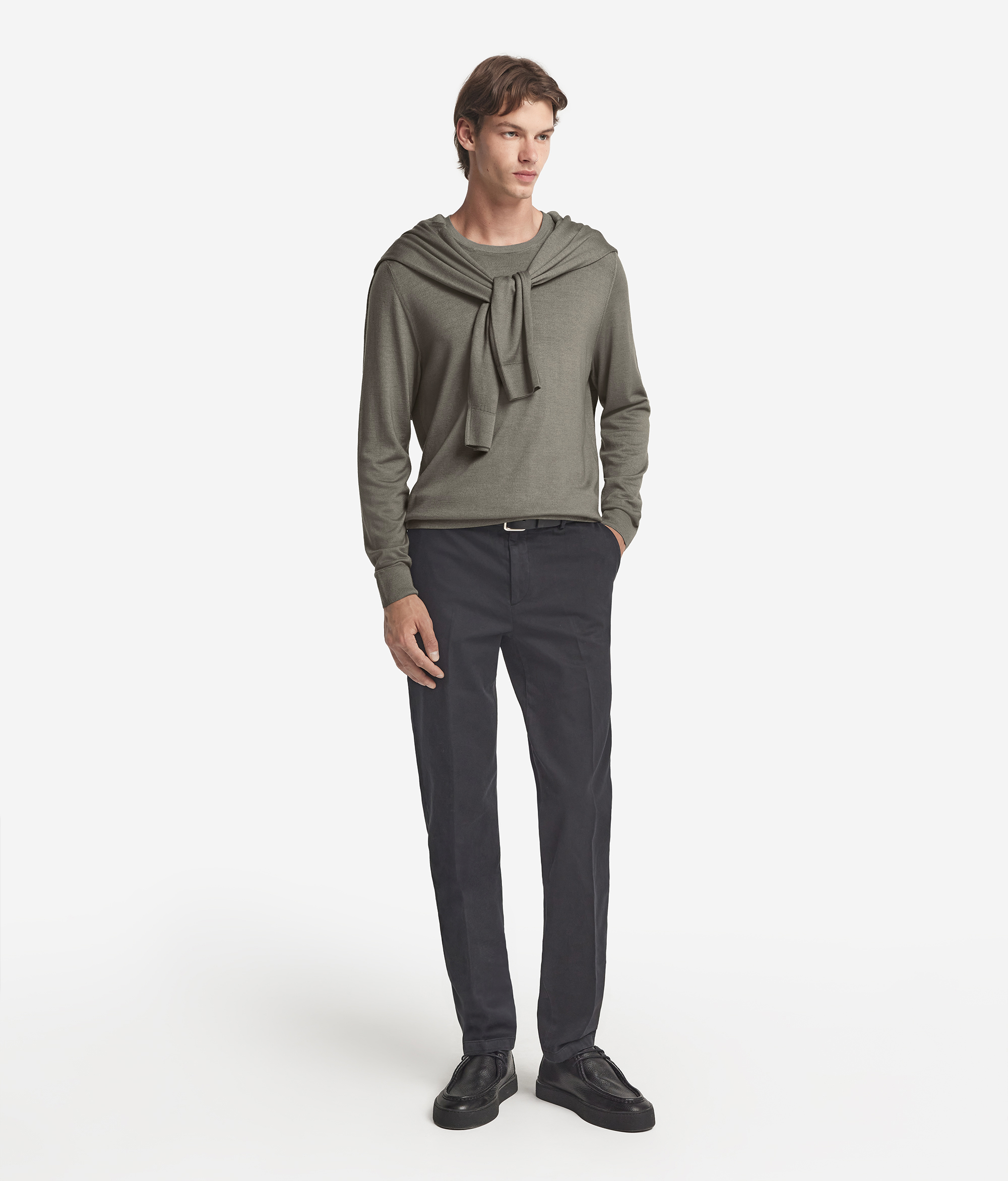 Этот джемпер с круглым вырезом горловины выполнен из натурального волокна, что придаёт ему вневременную элегантность. Мягкая и приятная на ощупь ткань обеспечивает лёгкость и комфорт, одновременно создавая обволакивающее тепло. Благодаря своей универсальности и изысканности, этот джемпер станет незаменимым элементом мужского гардероба. Его можно носить как самостоятельно, так и в сочетании с пиджаком для создания утончённого образа, подходящего для любого случая.