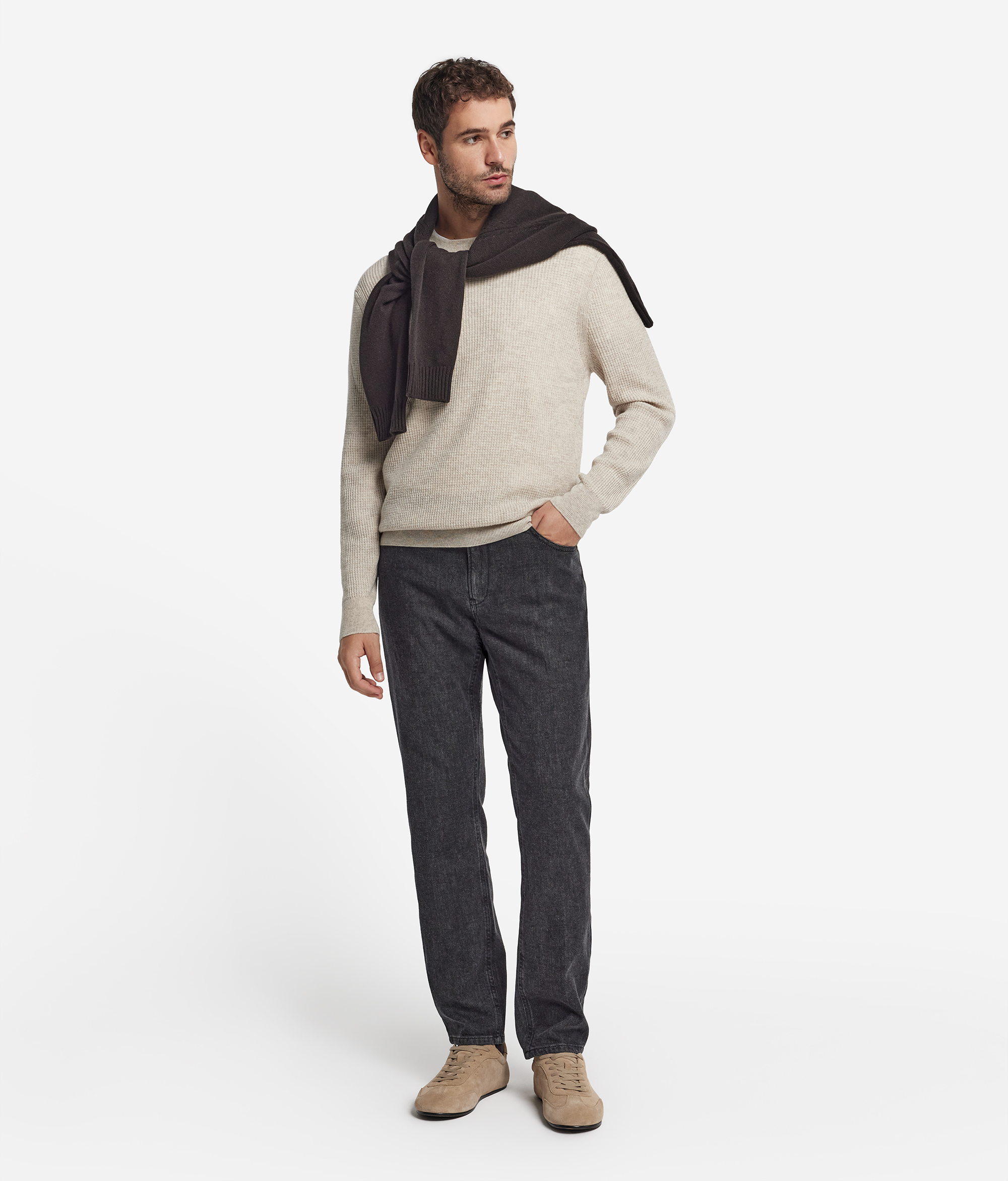 В этом изысканном базовом джемпере с круглым вырезом горловины выдержан идеальный баланс между комфортом и стилем. Фактурная вафельная вязка придаёт модели выразительность, а отделка в рубчик по краям и на горловине добавляет современное звучание. Длинные рукава и прямой крой подчёркивают лаконичность силуэта, а мягкость кашемира дарит ощущение уюта, превращая этот классический предмет гардероба в образец сдержанной роскоши вне времени.