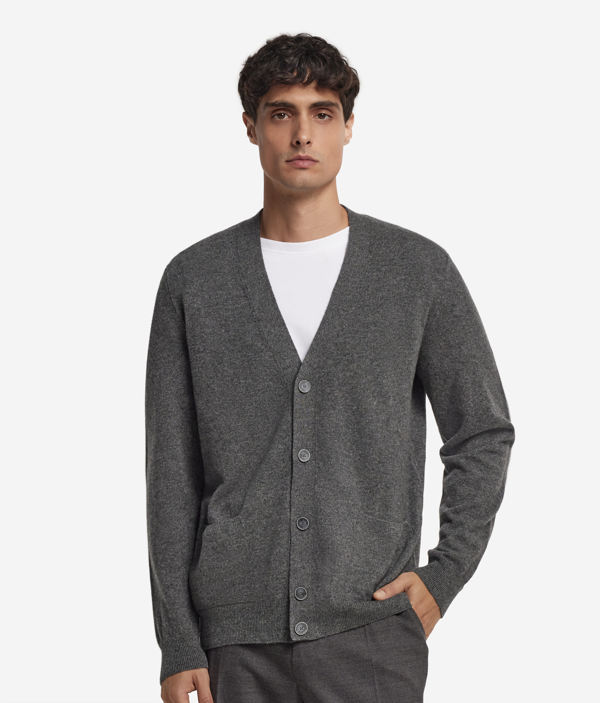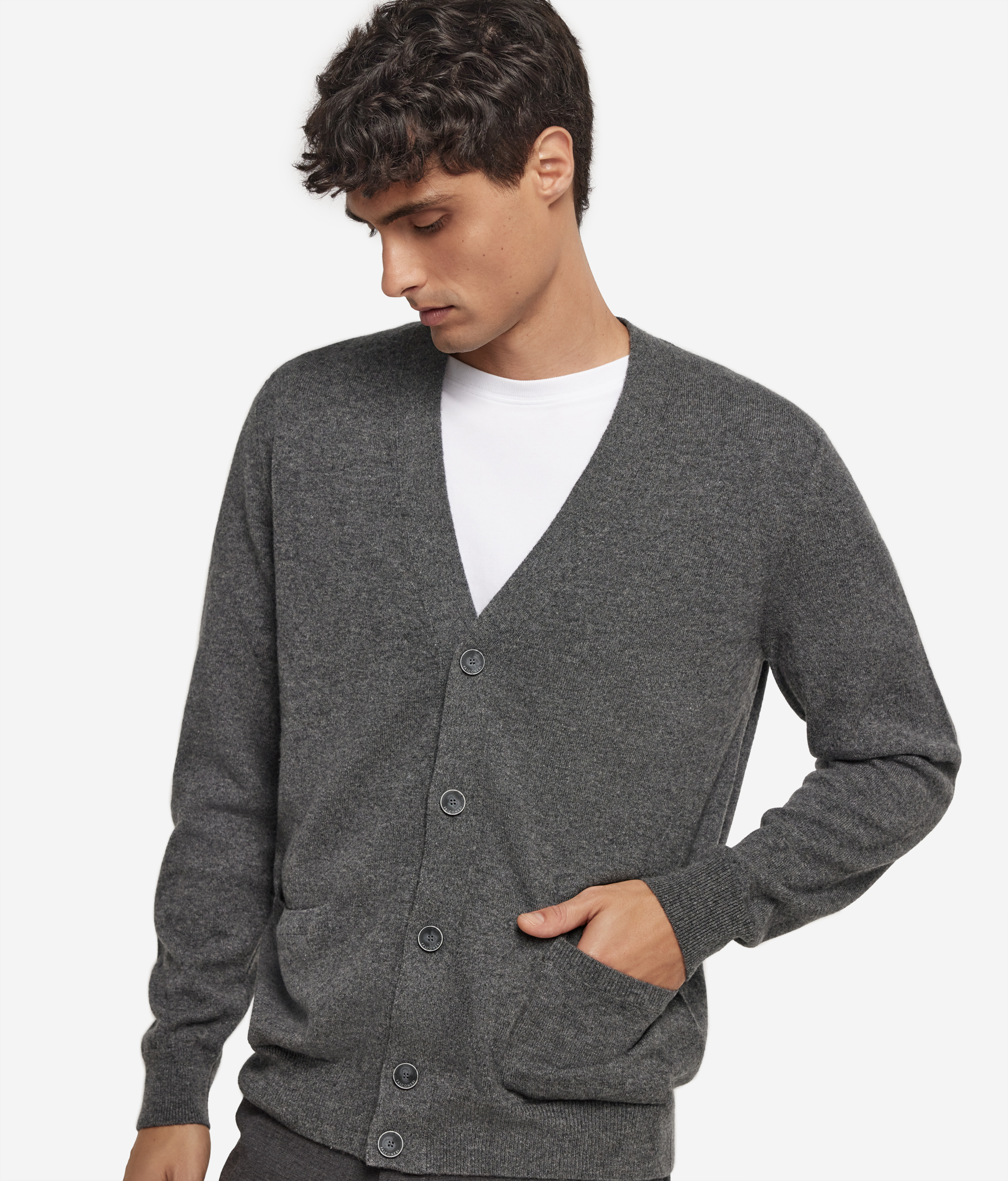 Этот уютный и изысканный кардиган из благородного ультрамягкого кашемира связан лицевой гладью, подчёркивающей нежную и однородную текстуру изделия. Классический силуэт дополнен V-образным вырезом горловины и центральной застёжкой на пуговицы, которые придают модели элегантную сдержанность и универсальность. Полуприлегающий крой обеспечивает комфортную посадку и свободу движений, а накладные карманы вносят в образ практичный и непринуждённый акцент.