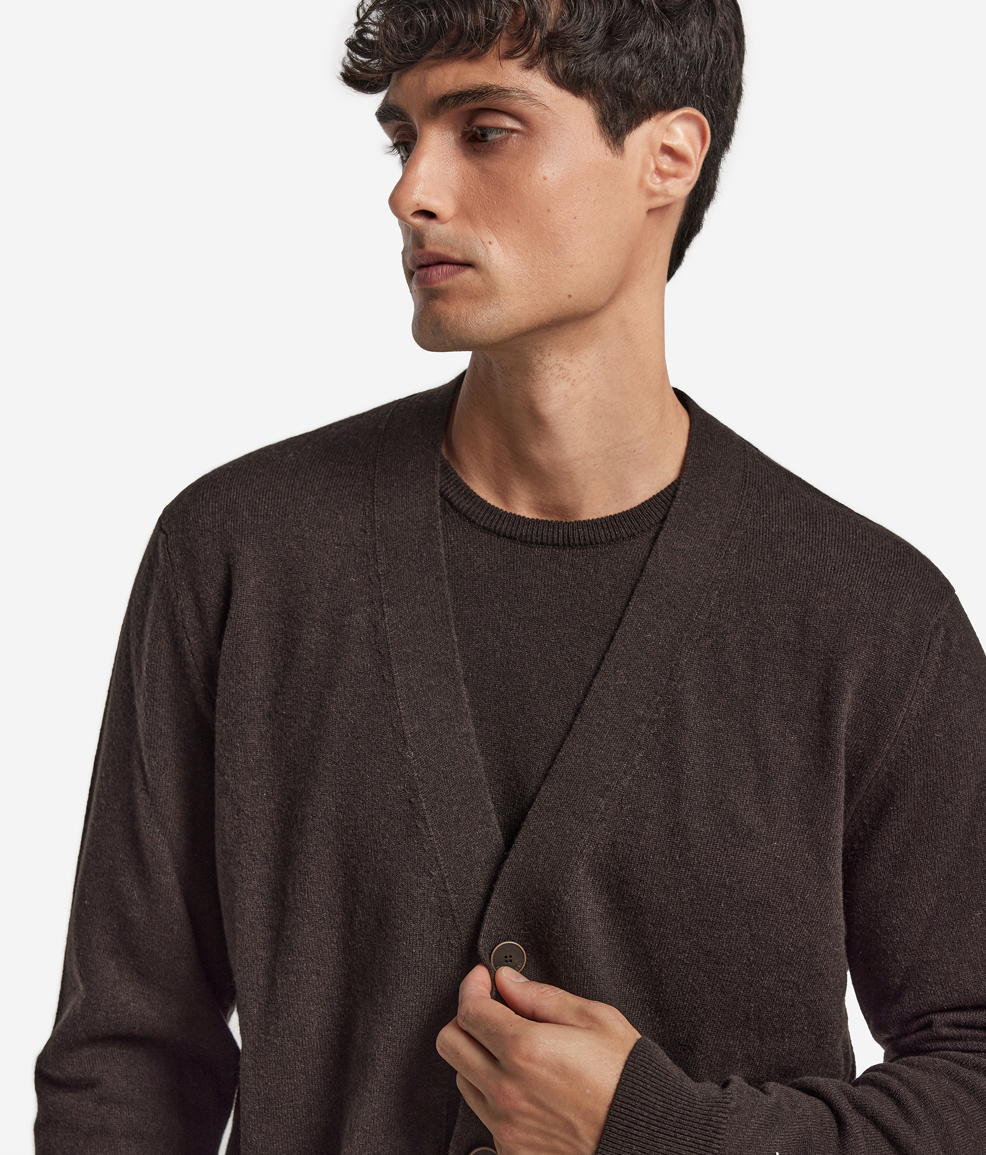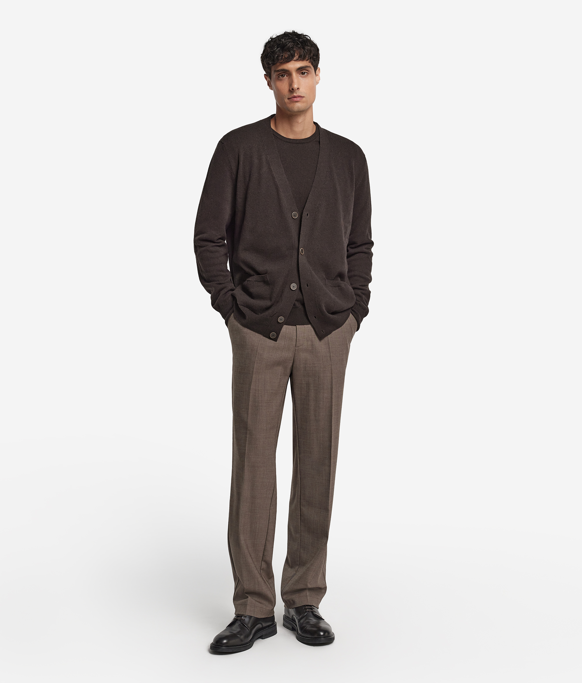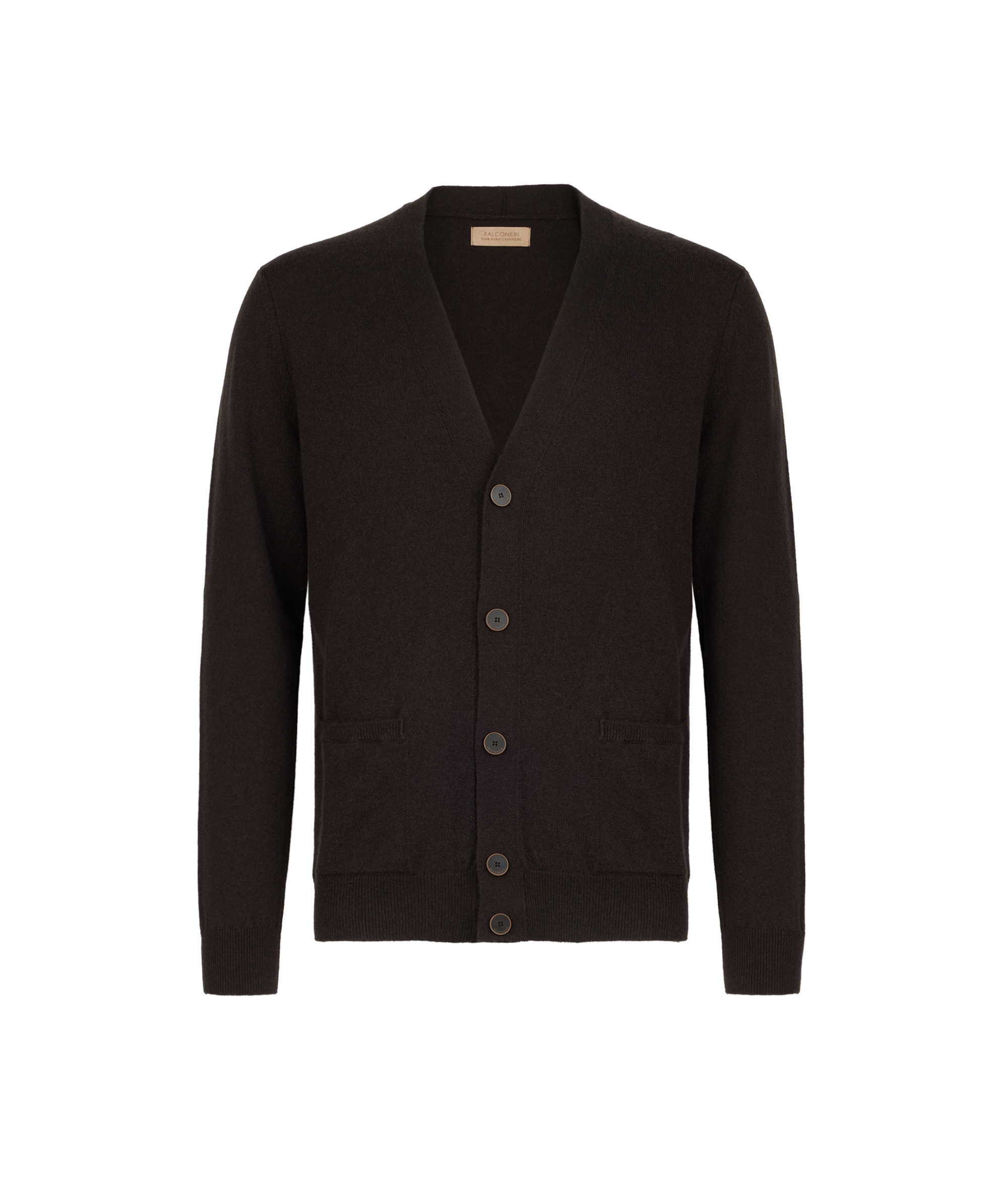 Этот уютный и изысканный кардиган из благородного ультрамягкого кашемира связан лицевой гладью, подчёркивающей нежную и однородную текстуру изделия. Классический силуэт дополнен V-образным вырезом горловины и центральной застёжкой на пуговицы, которые придают модели элегантную сдержанность и универсальность. Полуприлегающий крой обеспечивает комфортную посадку и свободу движений, а накладные карманы вносят в образ практичный и непринуждённый акцент.