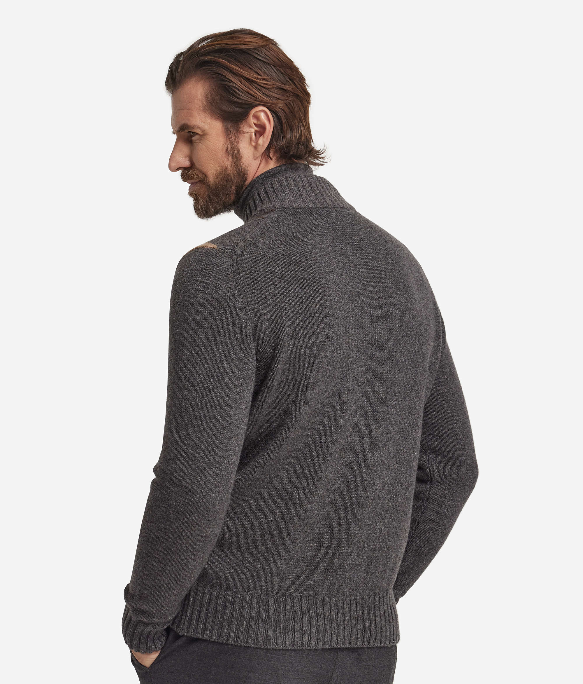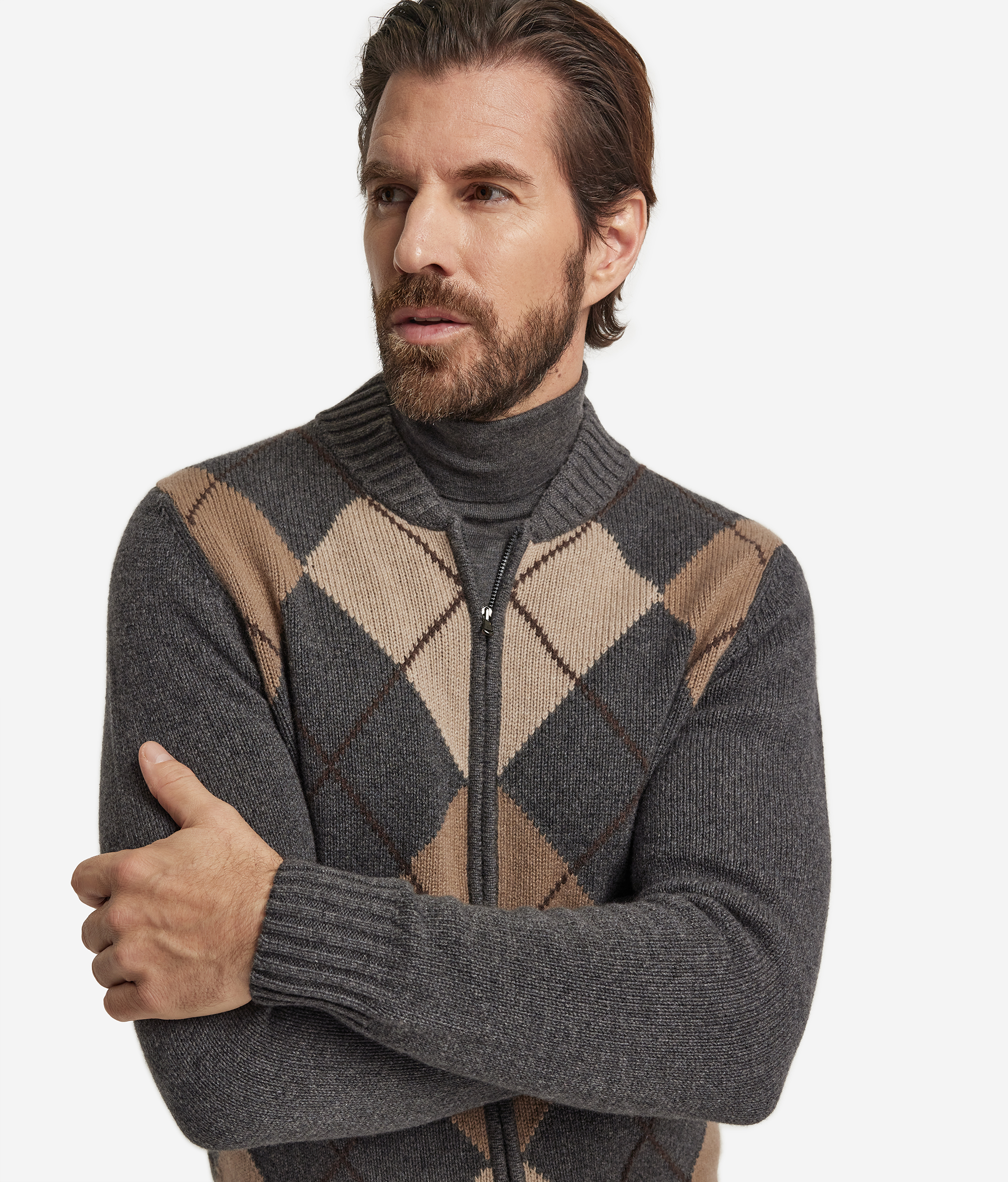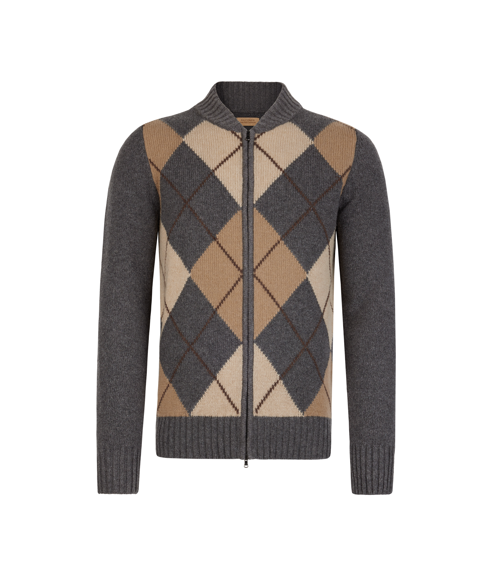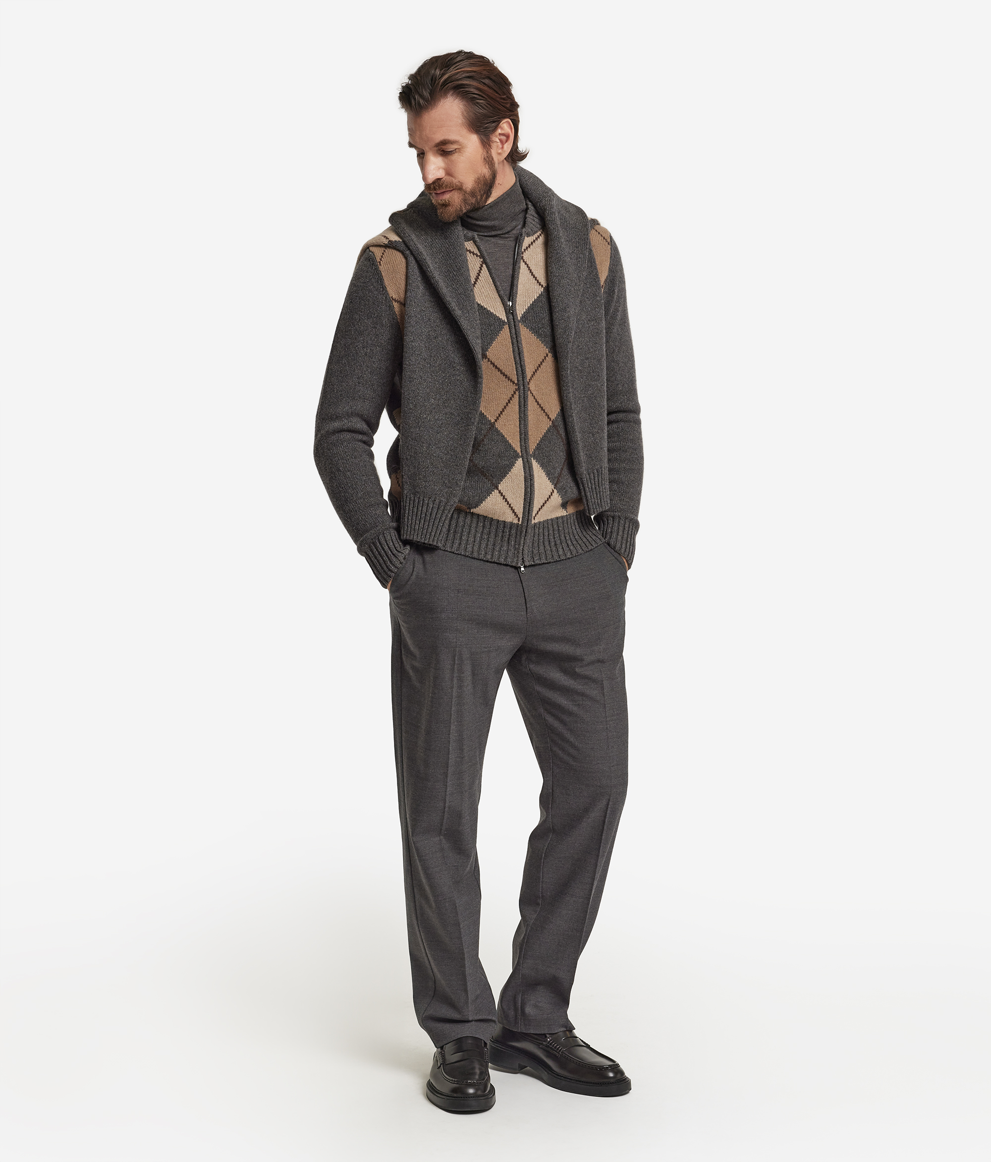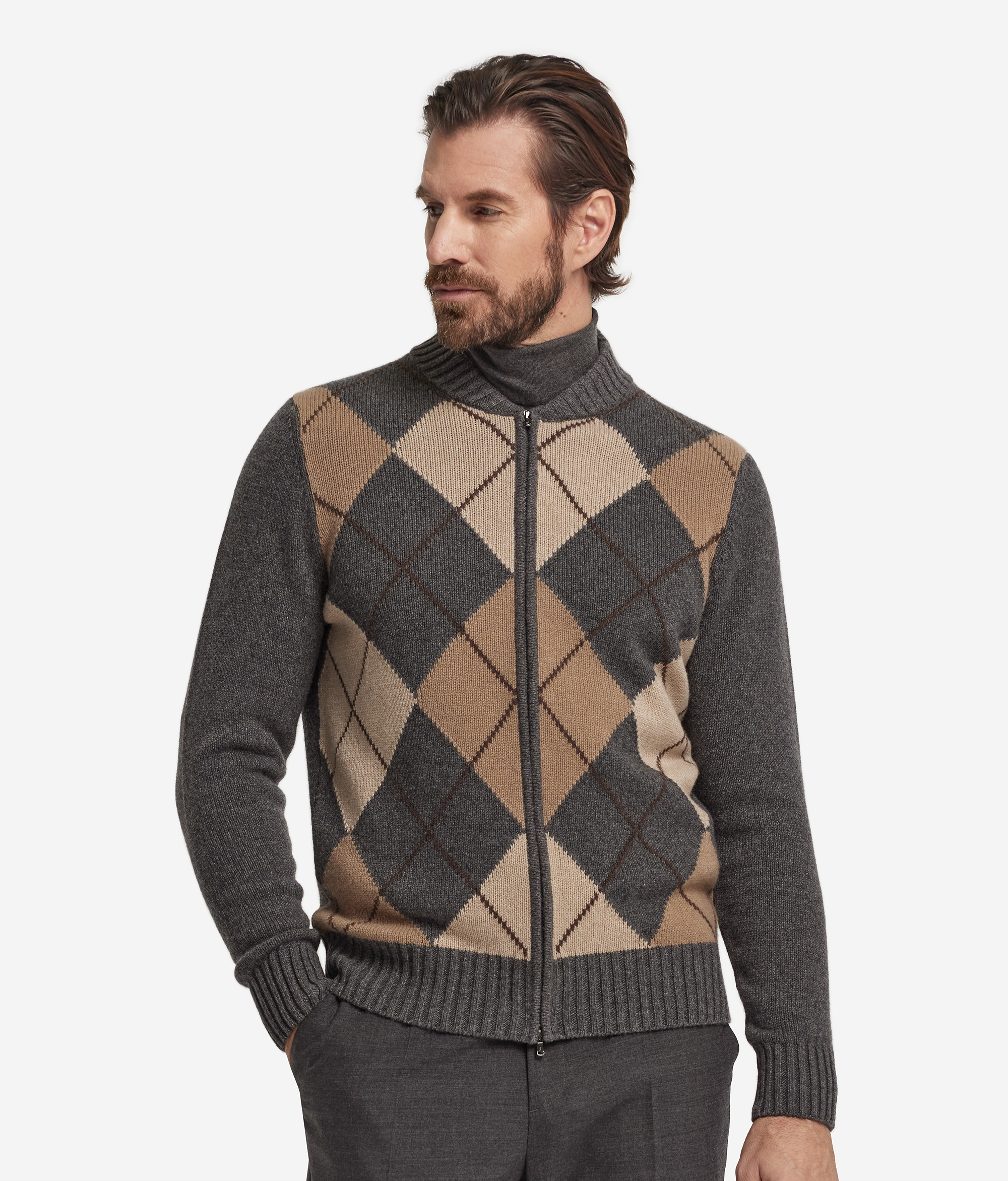 Кардиган из ультрамягкого кашемира едва ощутимо касается кожи, окутывая её своей необычайной нежностью. Ромбовидный узор придаёт полотну выразительность, а воротник в рубчик и линия плеч подчёркивают чистоту силуэта. Длинные рукава и практичная застёжка-молния вносят в образ современный акцент. Благодаря полуприлегающему крою модель дарит свободу движений и легко вписывается в элегантный непринуждённый гардероб.
