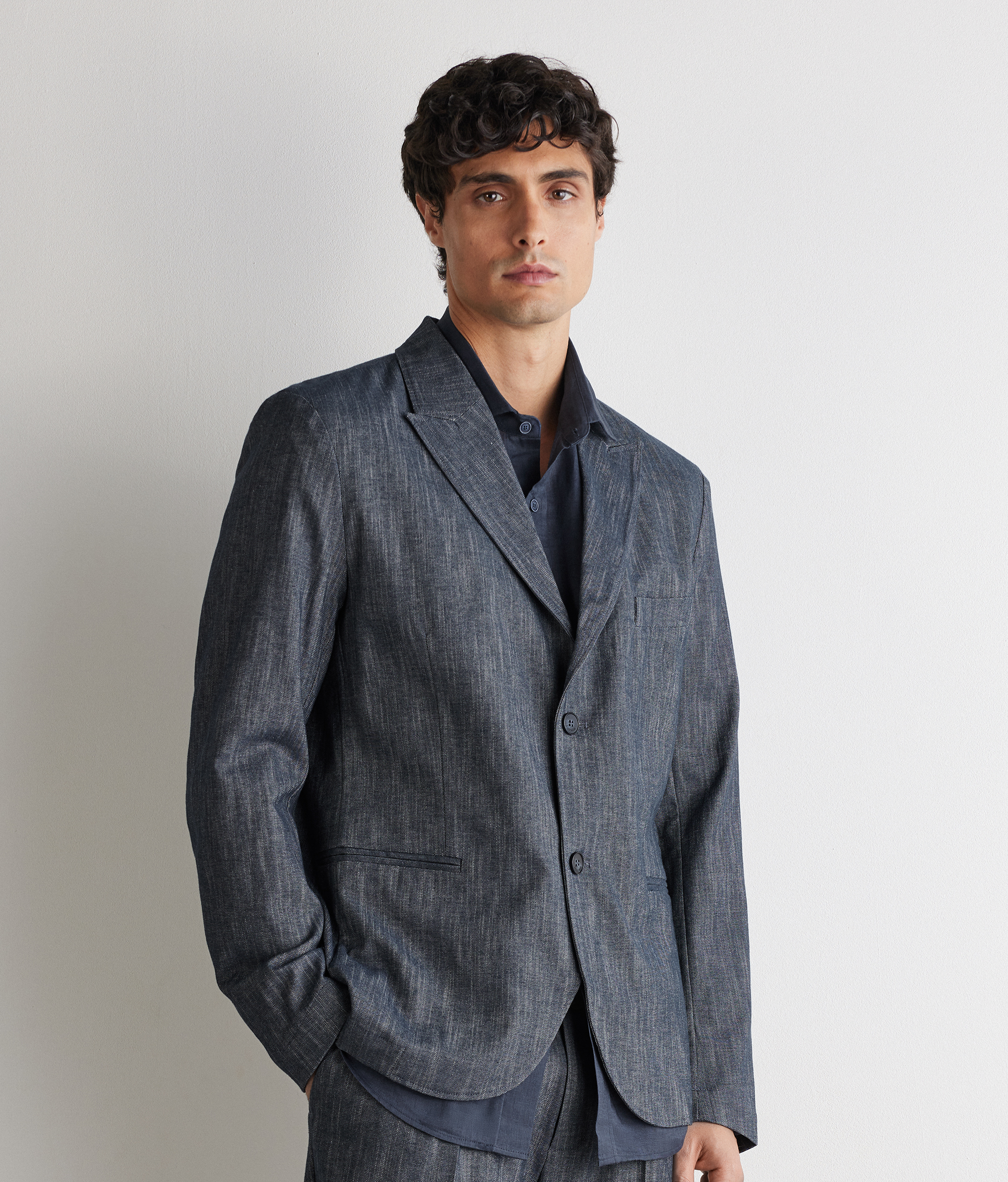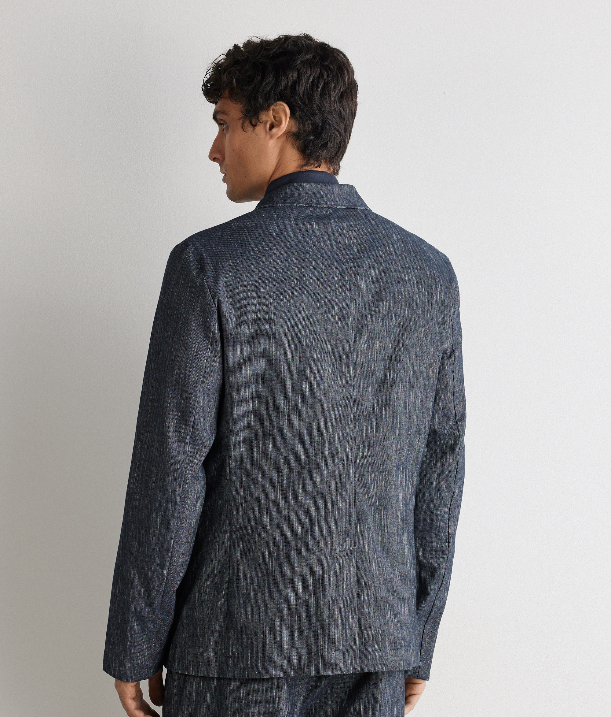 Пиджак в непринуждённом утончённом стиле. Элегантный эффект денима подчёркивает текстуру ткани. Заострённые лацканы с отстрочкой создают изысканный современный силуэт, а однобортная застёжка на две пуговицы является классической деталью. Прорезные карманы с двойной листочкой и шлица сзади завершают дизайн изделия в стиле неброской элегантности. Стандартный крой модели делает её современной, универсальной и изысканной.
