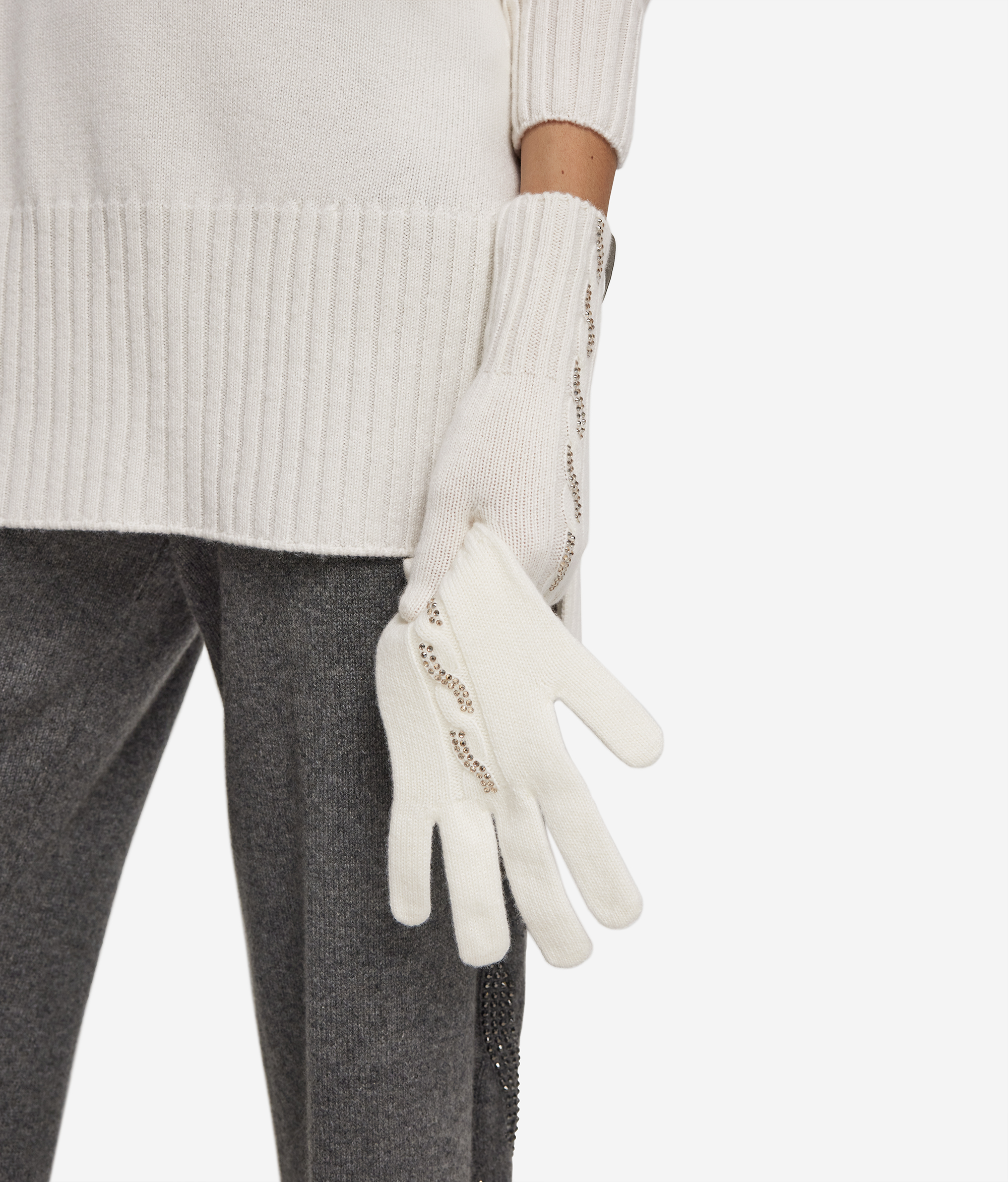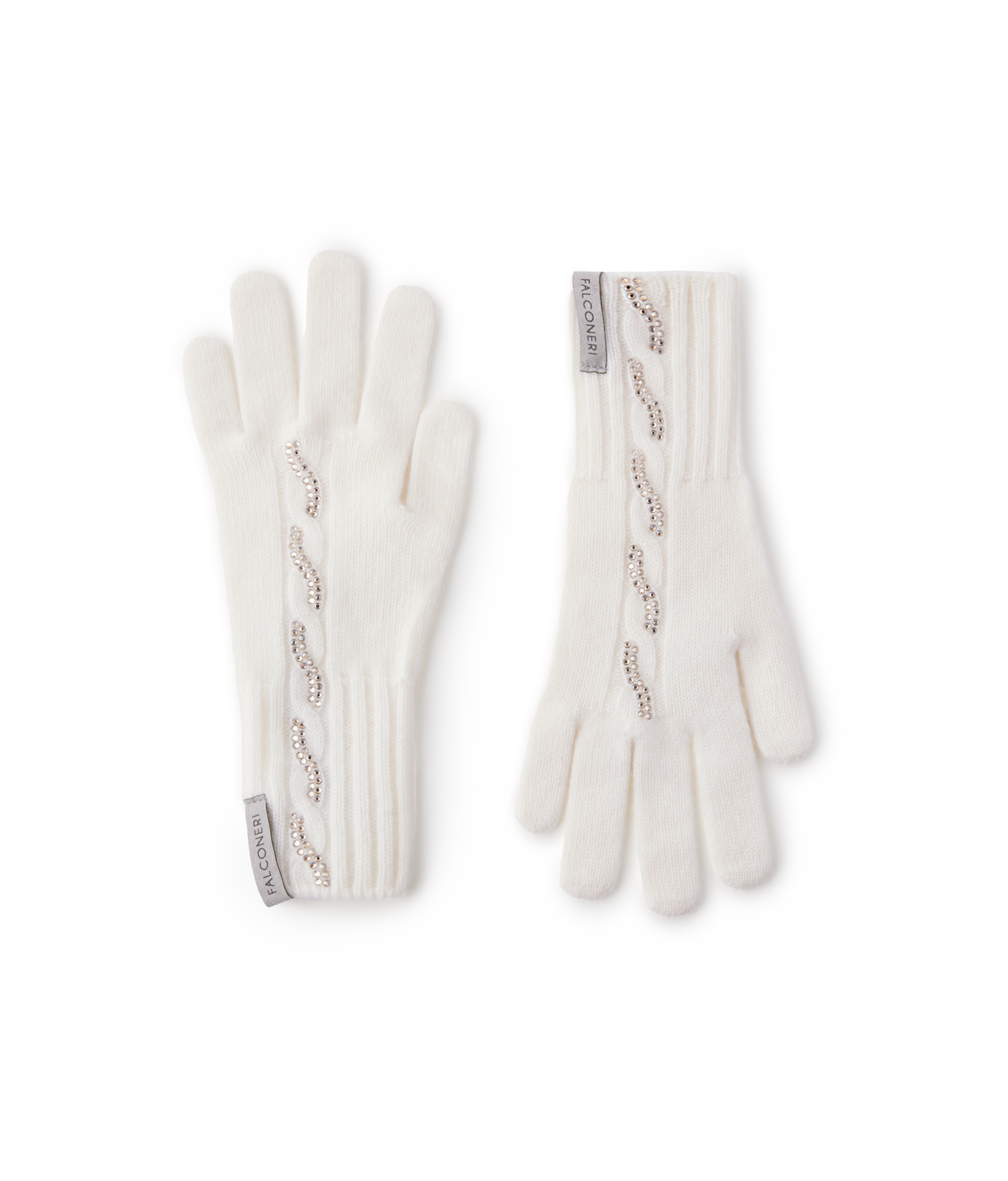 Перчатки из ультрамягкого кашемира очаровывают своей нежностью и изяществом. Вертикальный узор «косичка» по центру сочетается с декором из стразов, которые придают образу лёгкое свечение. Отделка в рубчик на манжетах подчёркивает изящество рук и помогает сохранять тепло, а чистые линии силуэта делают модель универсальным дополнением к любому наряду — от классического пальто до современного городского образа.