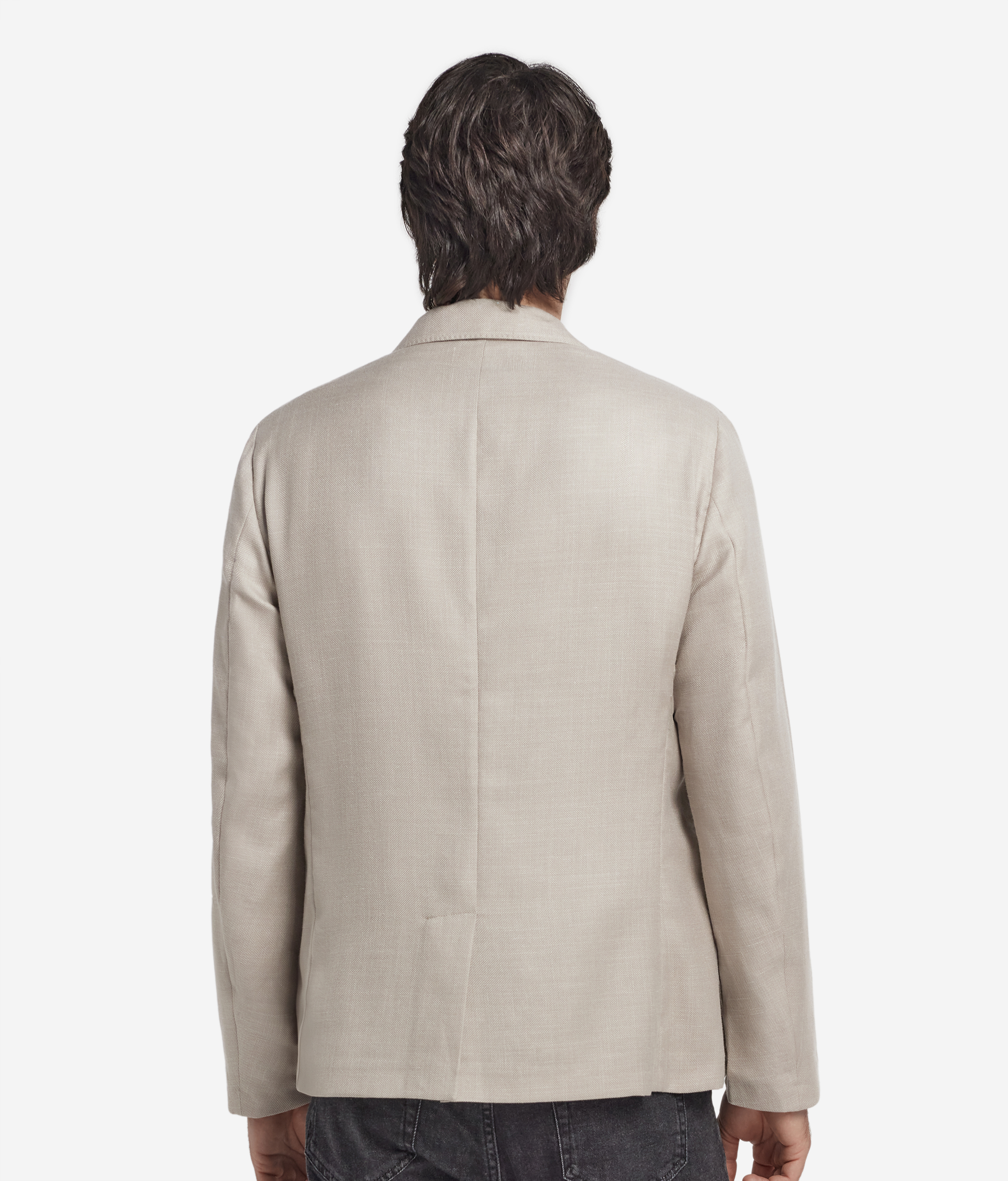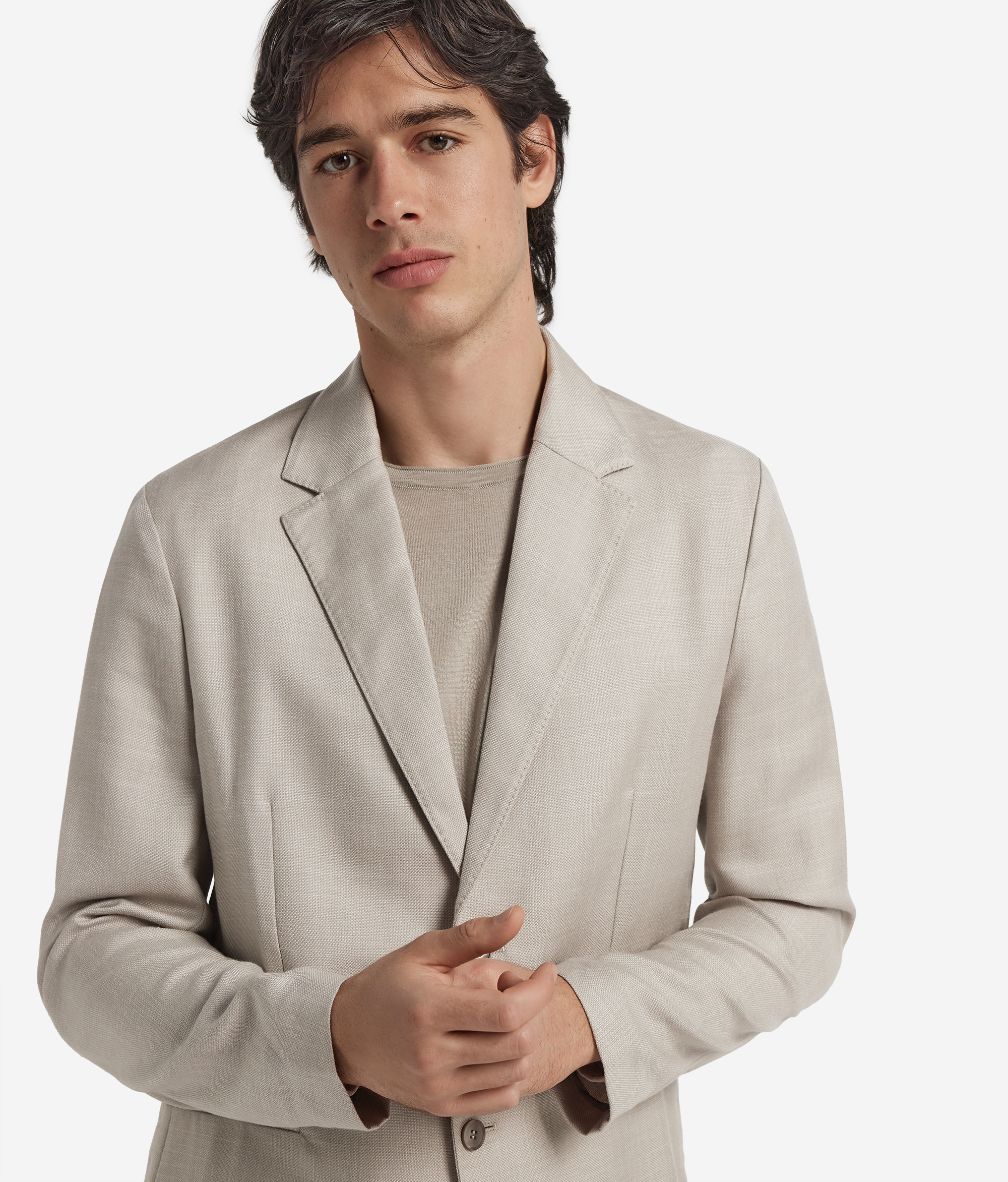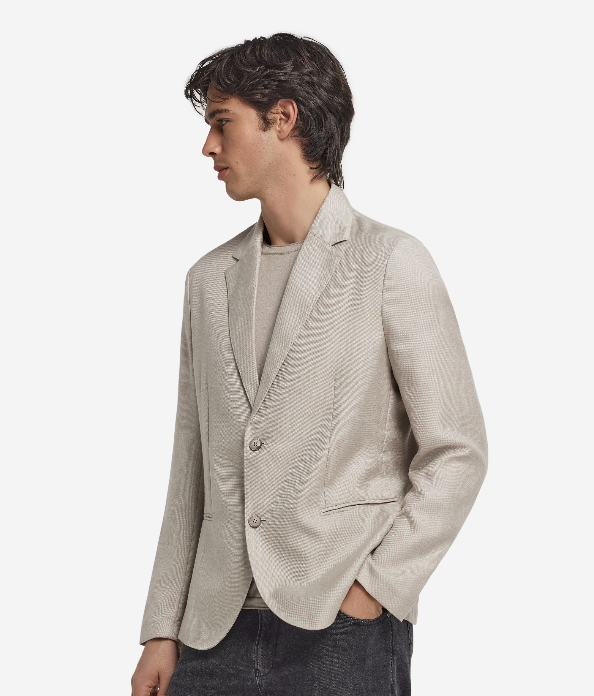 Однобортный жакет, изготовленный из роскошной ткани, содержащей кашемир, шелк и лен. Застежка на две пуговицы располагается по центру, а спереди расположены накладные карманы. Нежная текстура материала гарантирует комфортную посадку.