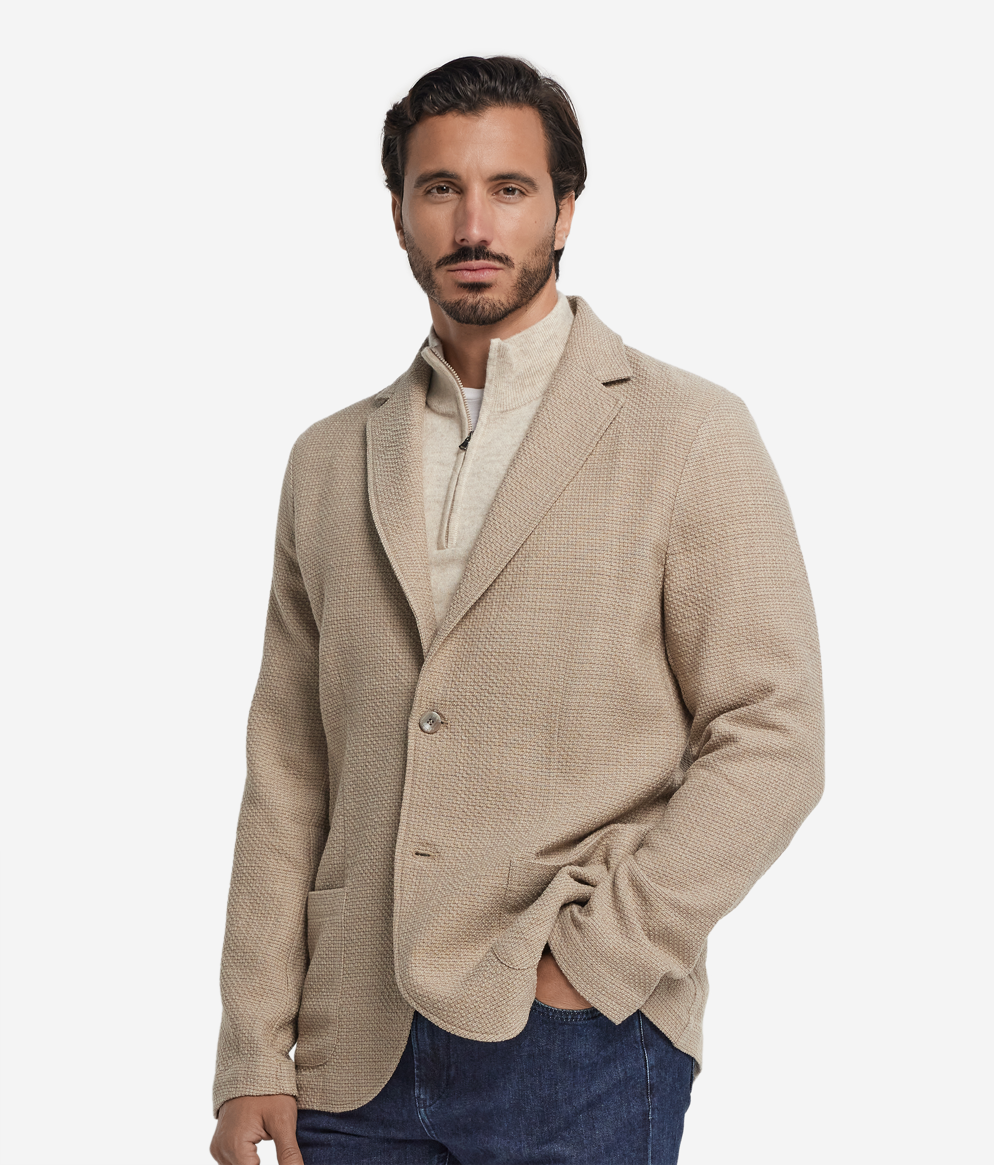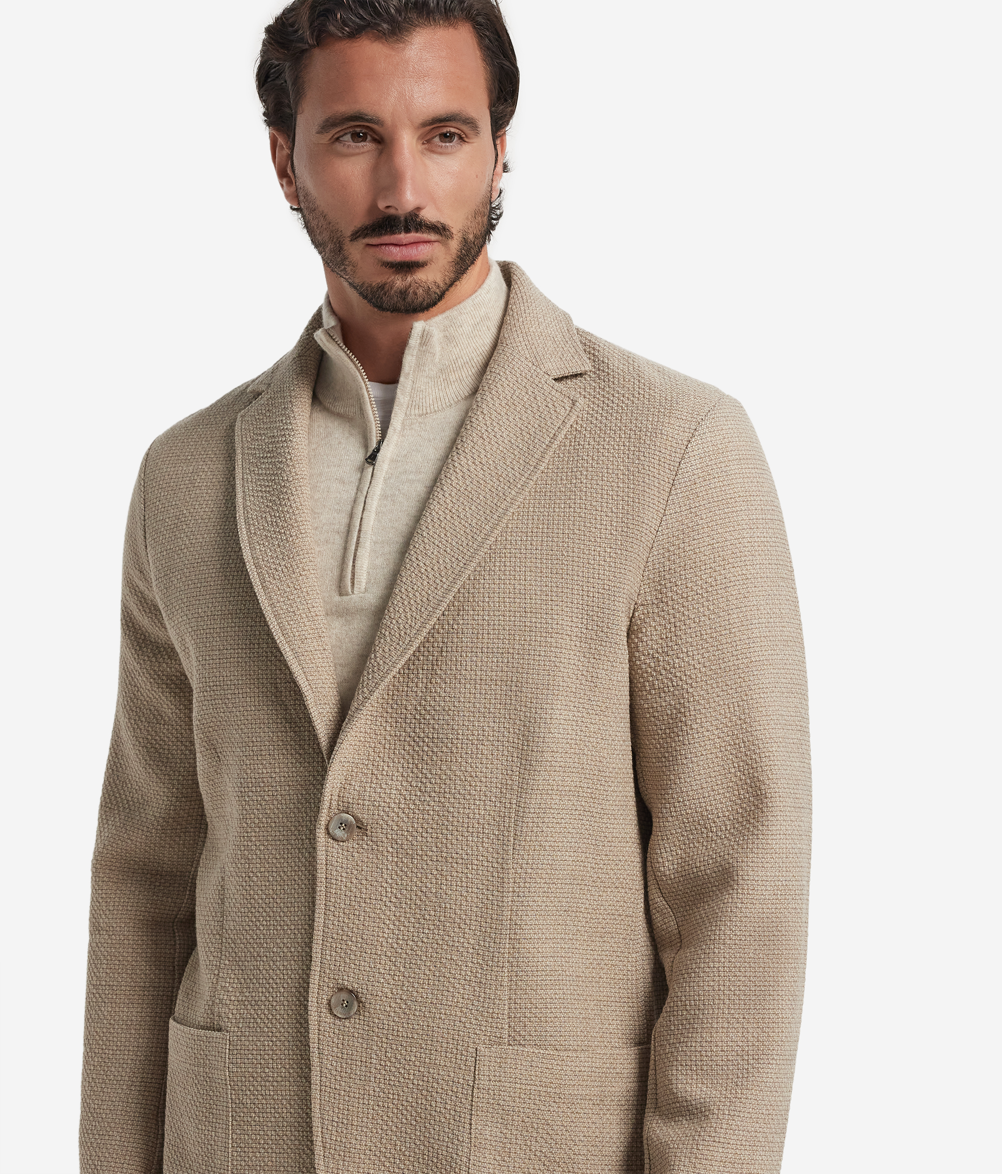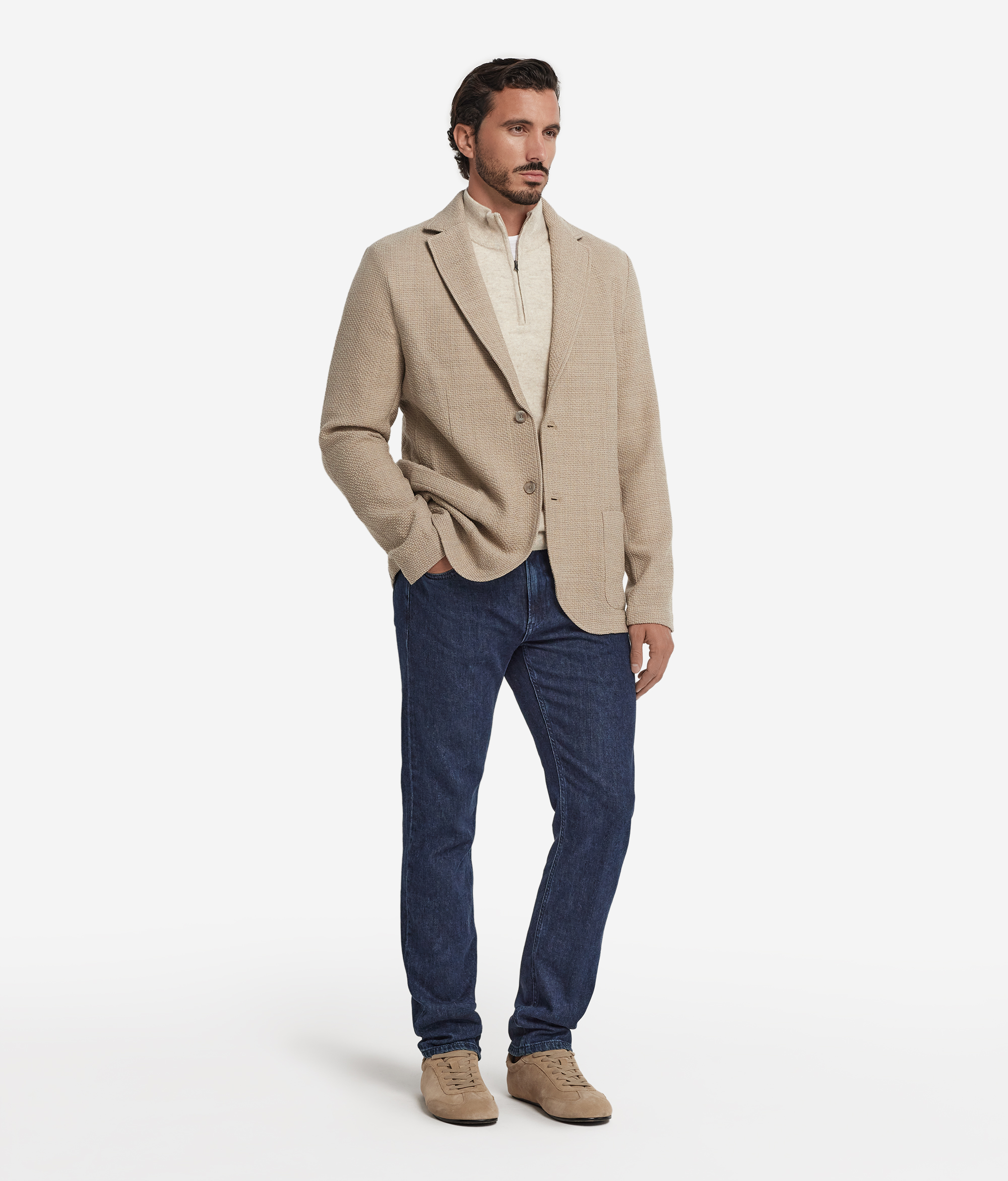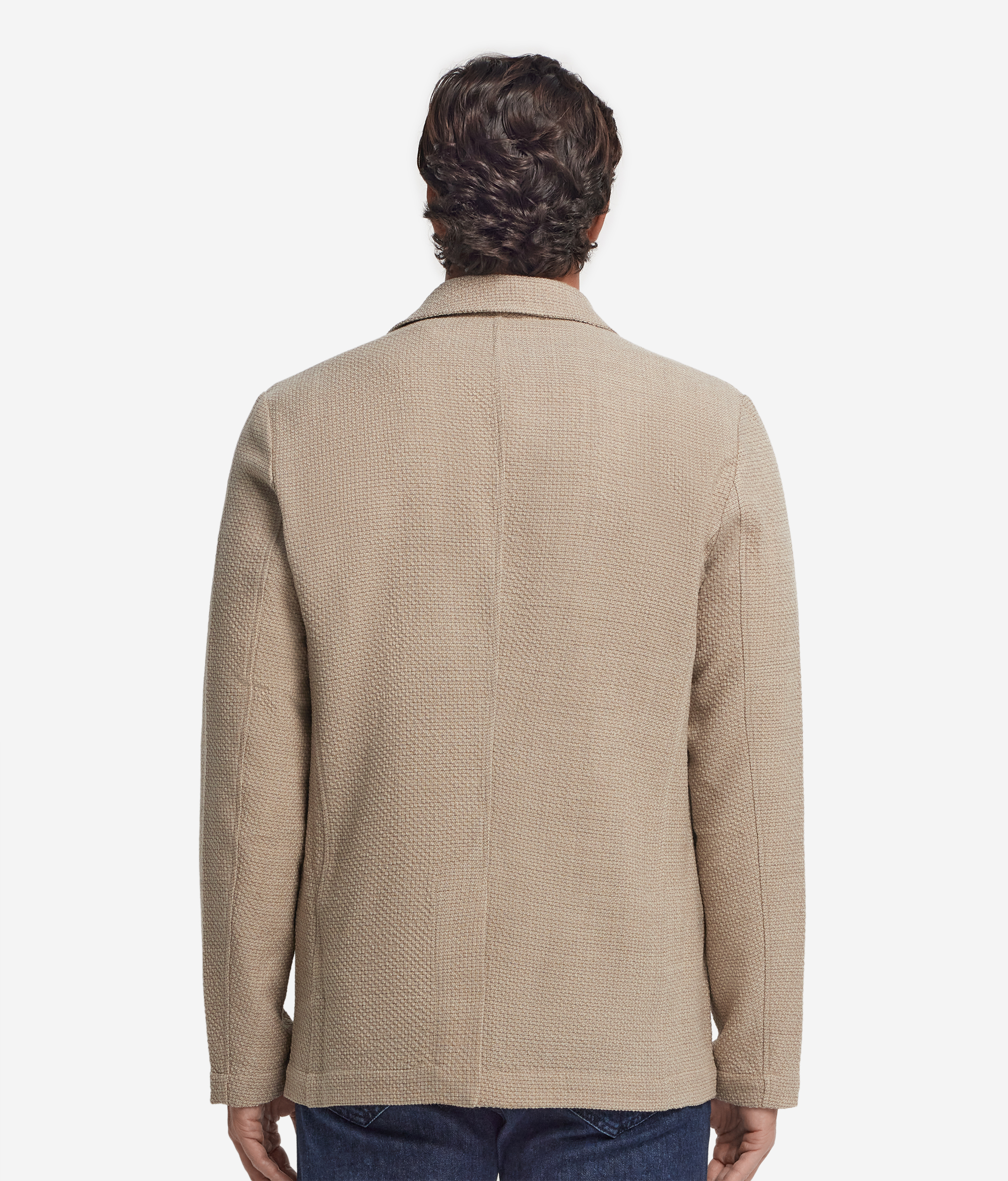 Благородная текстура шерсти мулине с характерной меланжевой нитью придаёт этой модели глубину и особую мягкость. Сдержанный, но выразительный — этот пиджак воплощает современное прочтение классической элегантности. Простроченные лацканы и накладные карманы отсылают к традициям портновского искусства, а однобортная центральная застёжка на пуговицы и разрез сзади создают чистый силуэт, в котором идеально выдержан баланс между изысканностью и лаконичностью.