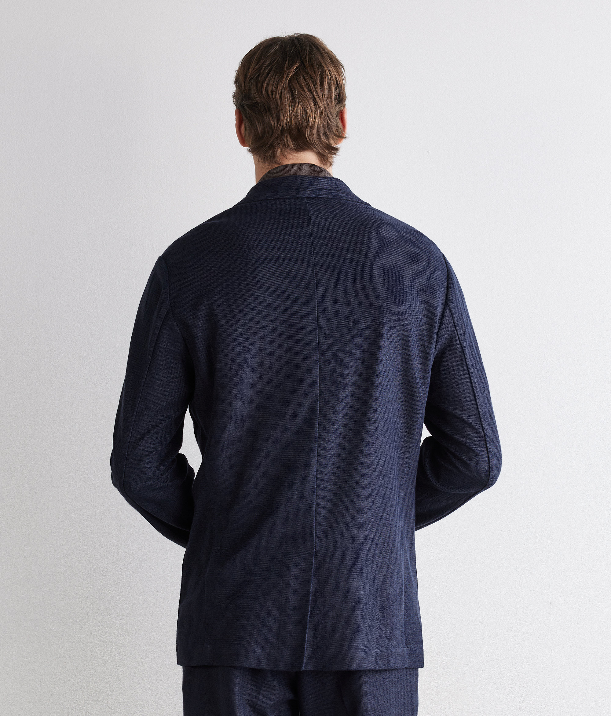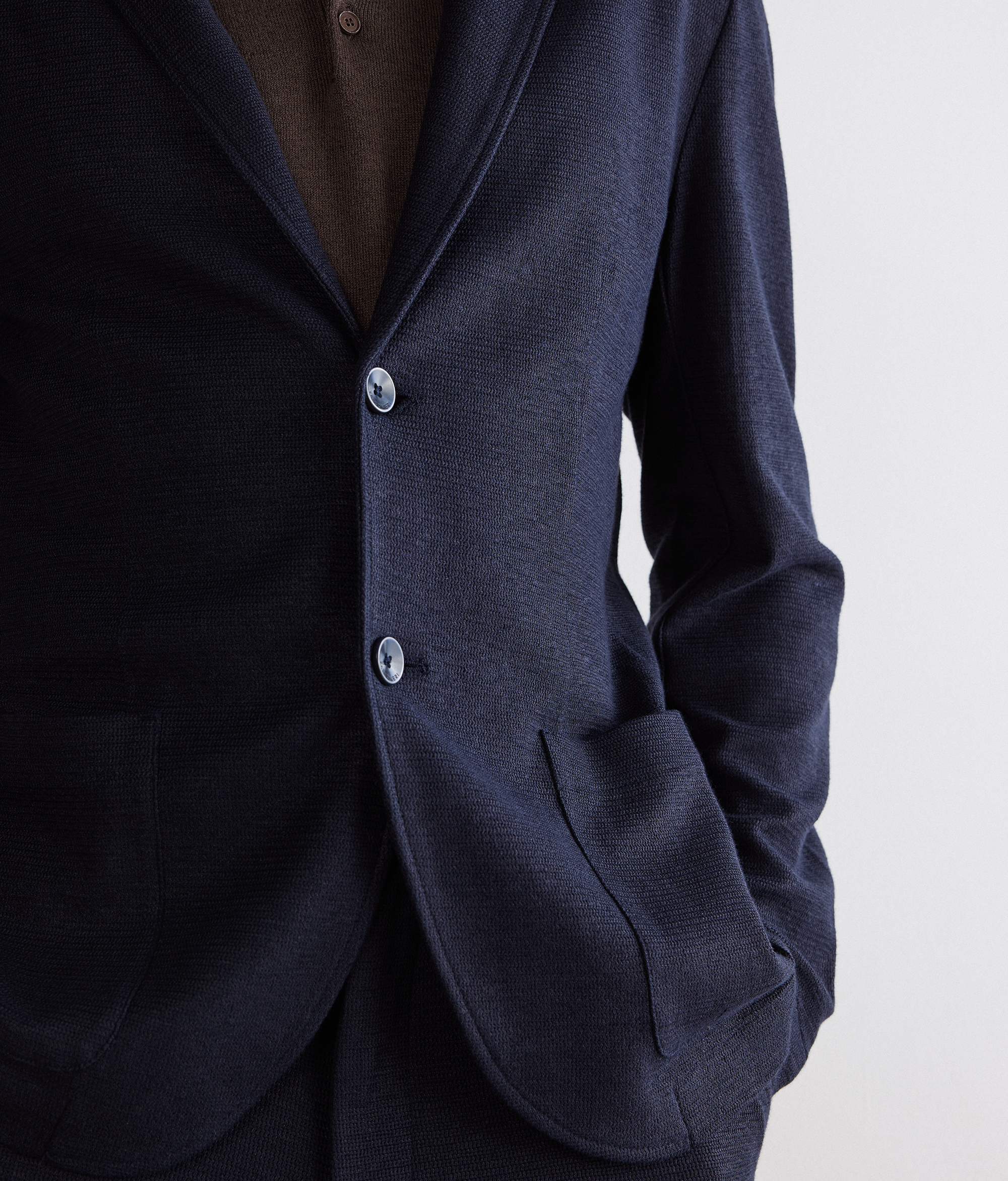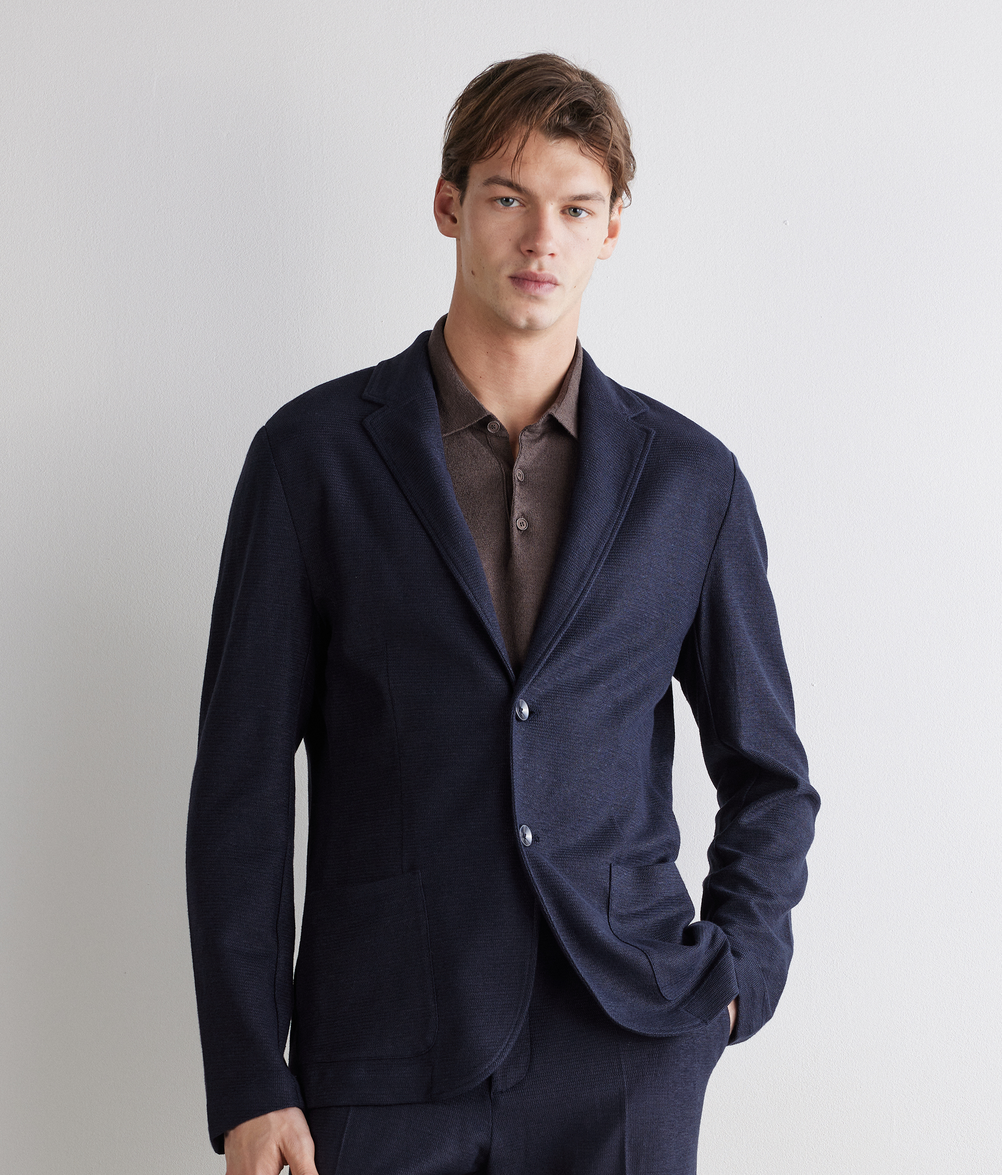Пиджак из высококачественной ткани с вафельным узором на основе льна и хлопка сочетает изысканную текстуру с современным дизайном. Классические лацканы и однобортная застёжка на две пуговицы подчёркивают его неизменно актуальную элегантность. Накладные карманы и шлица по центру сзади завершают изысканный силуэт этого изделия стандартного кроя.