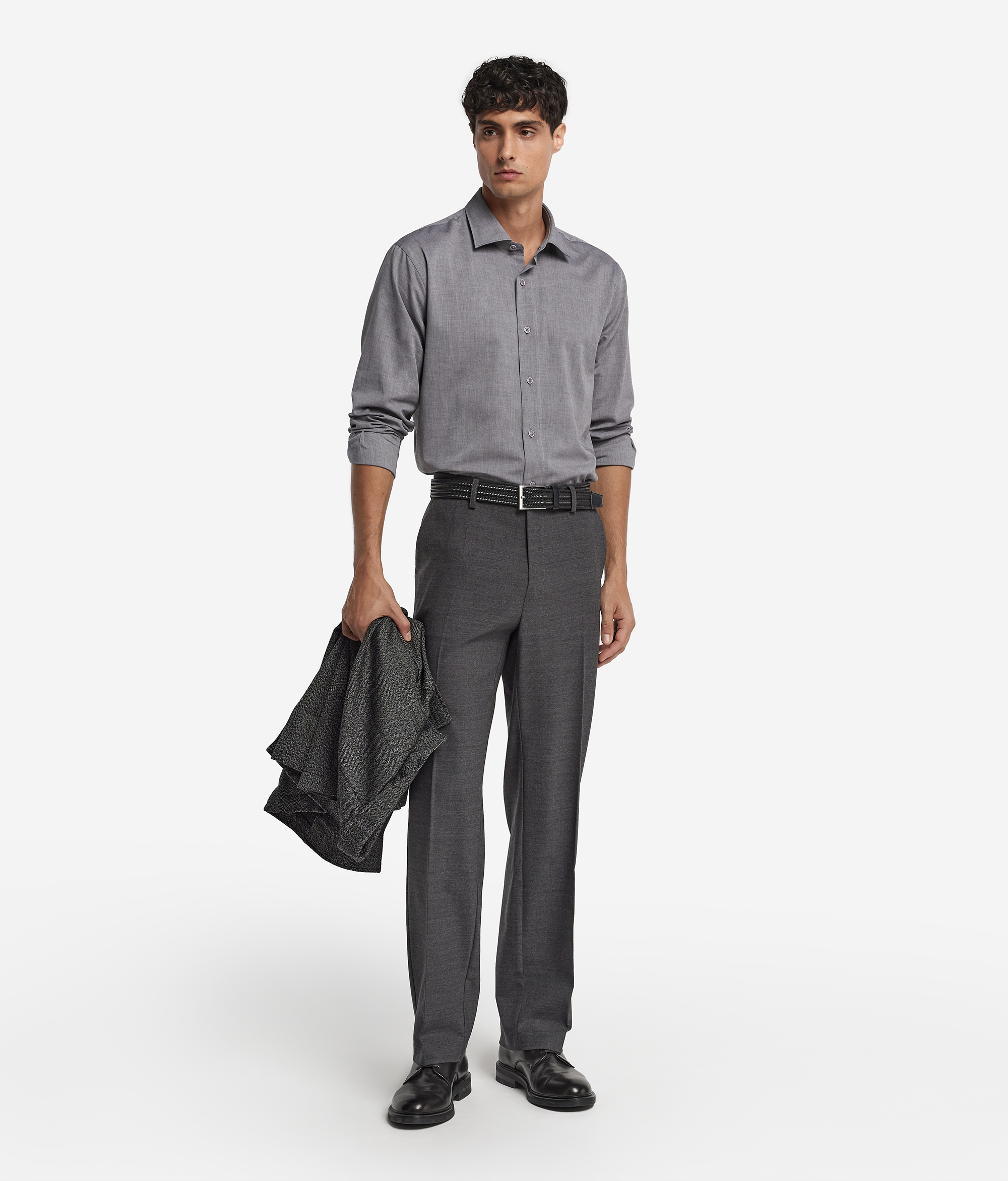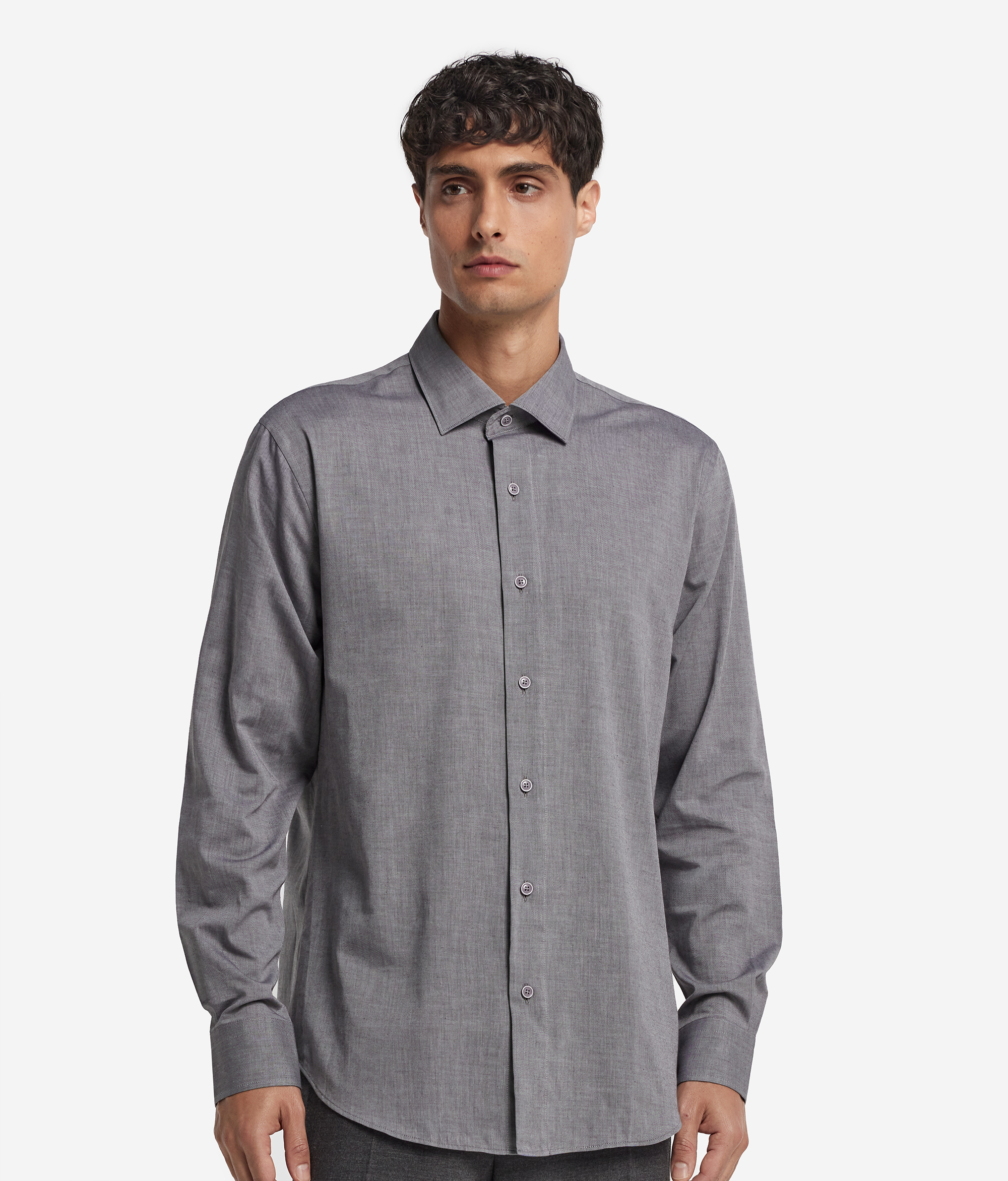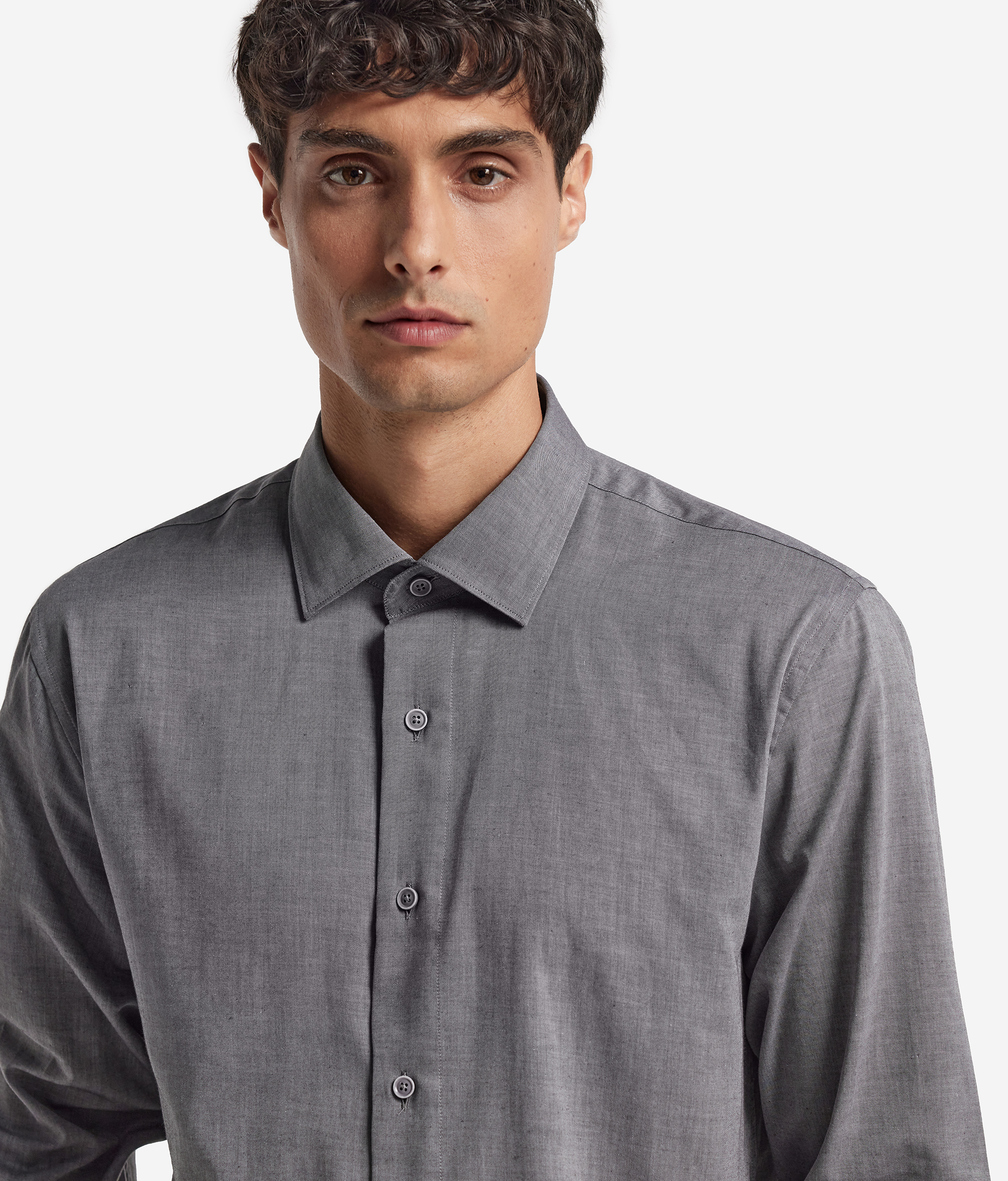 Союз утончённого минимализма и благородных материалов — именно так можно описать характер этой рубашки из лёгкой и приятной на ощупь хлопковой ткани с добавлением кашемира. Минимум деталей усиливает чистоту линий, а строгий воротник и скрытая под планкой застёжка подчёркивают современную геометрию силуэта. Это универсальная модель вне времени: её можно носить как самостоятельный элемент или сочетать с пиджаком и джемперами, создавая изысканные многослойные образы.