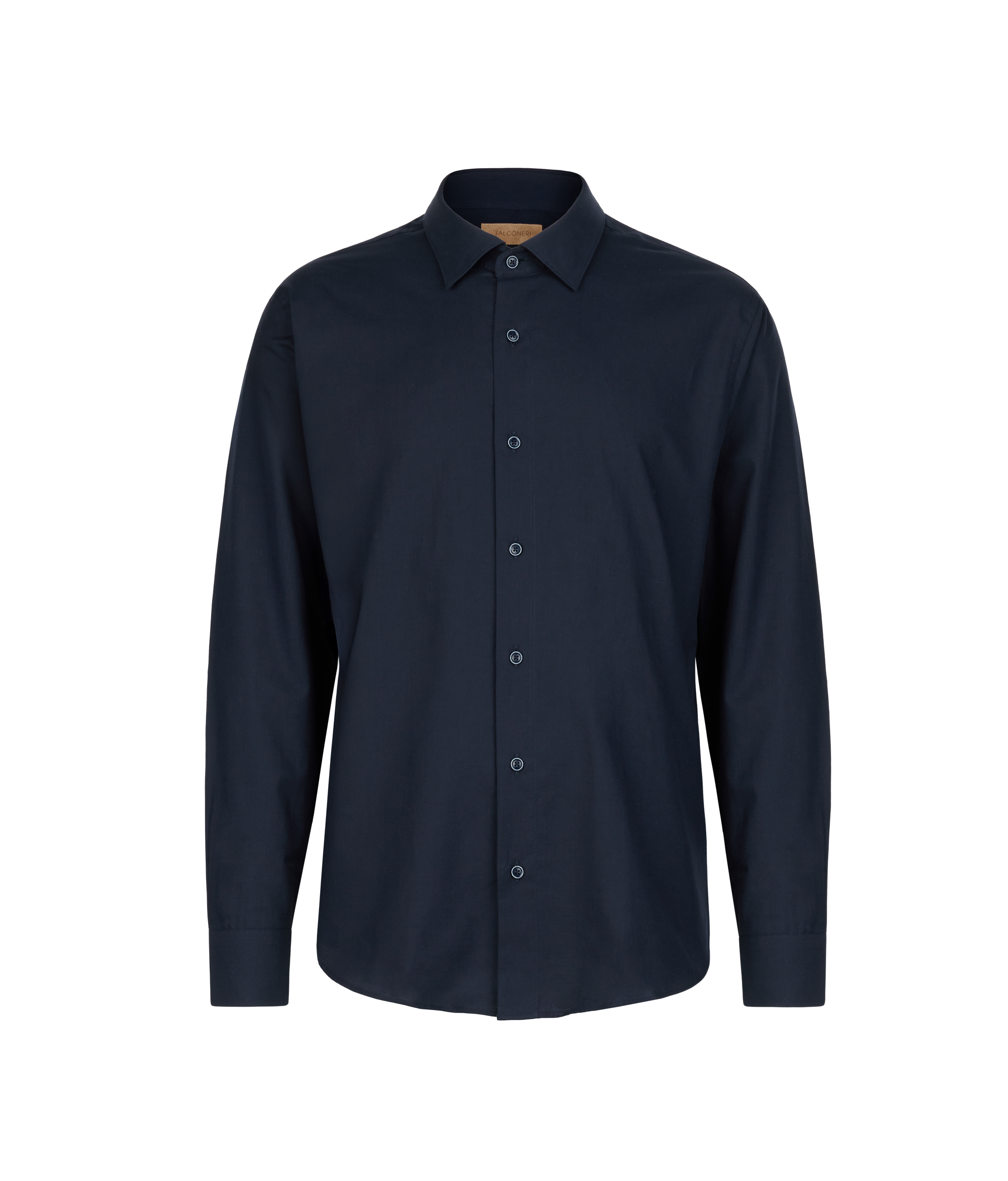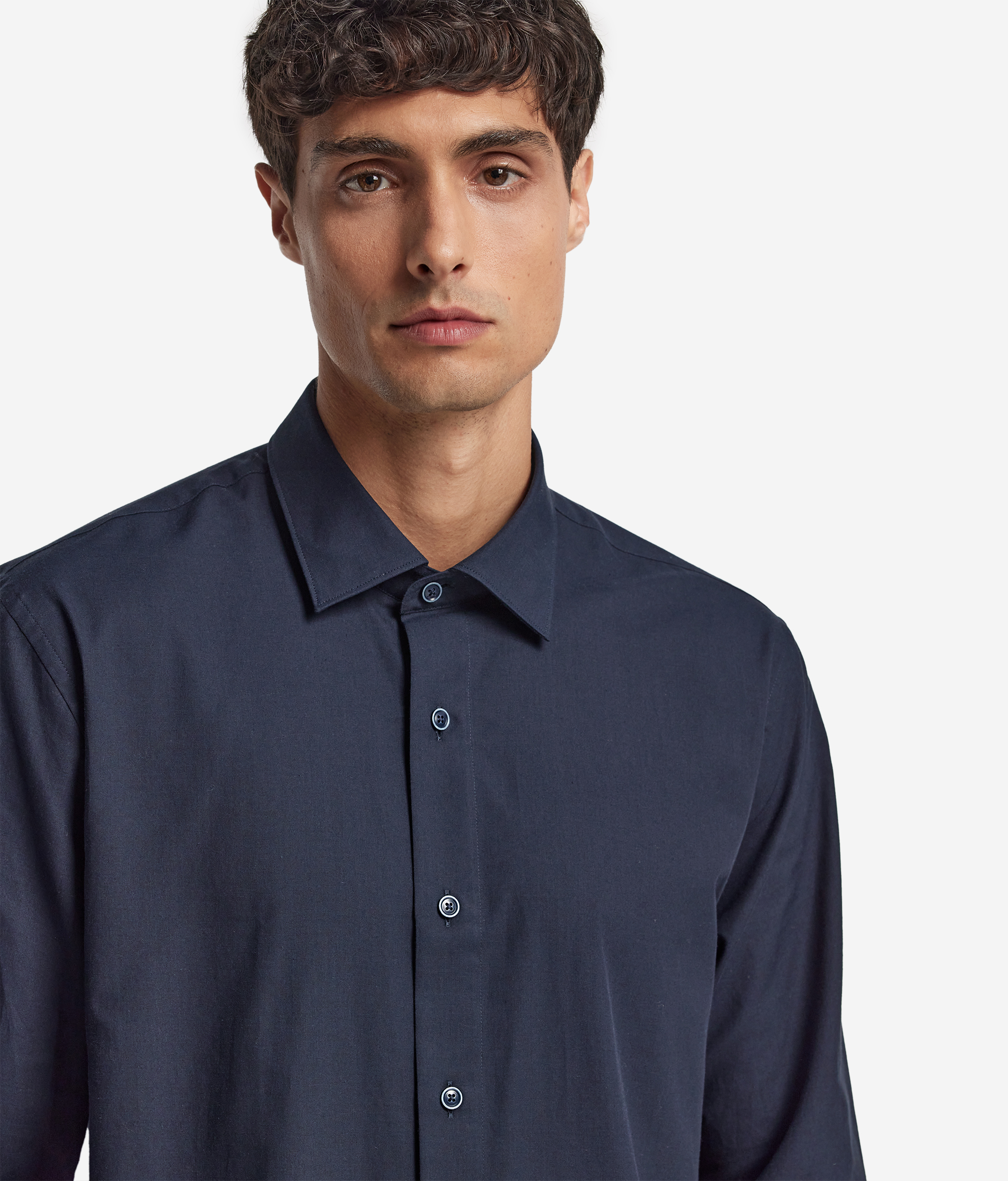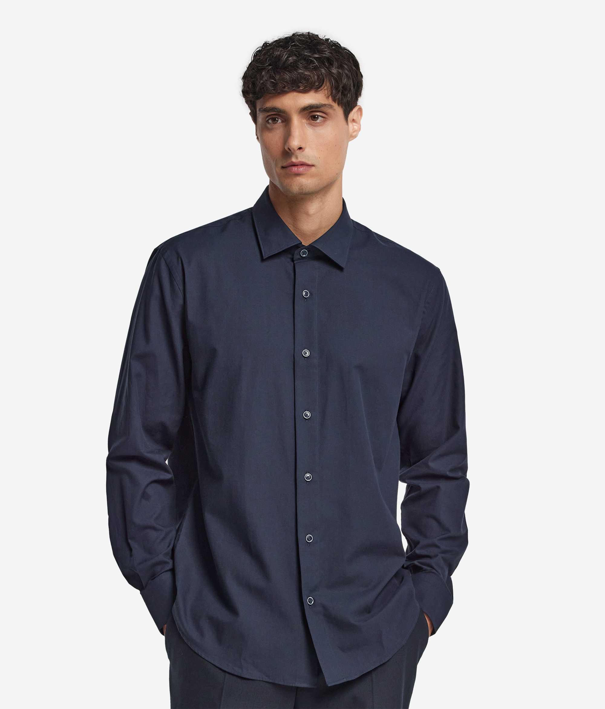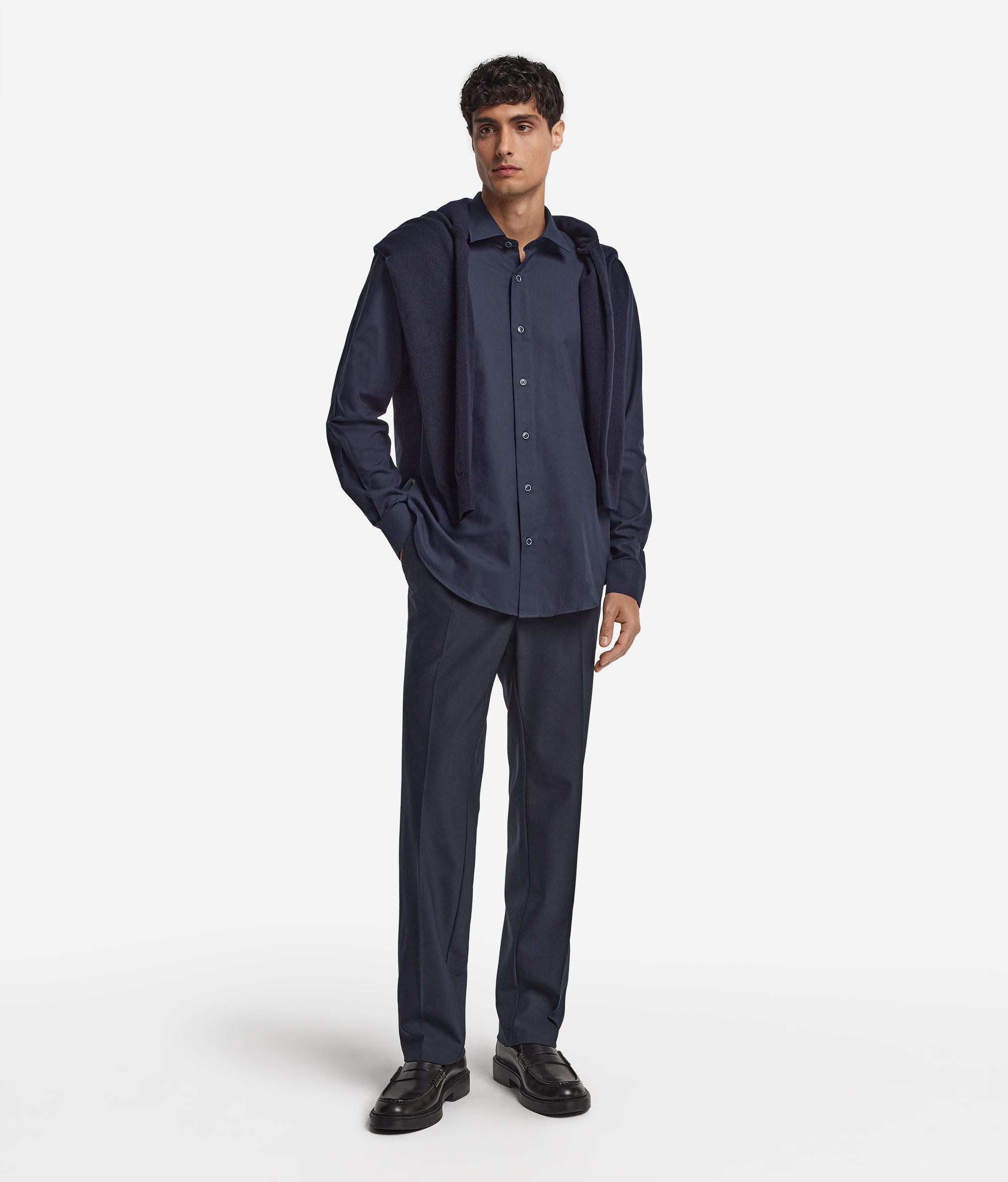 Союз утончённого минимализма и благородных материалов — именно так можно описать характер этой рубашки из лёгкой и приятной на ощупь хлопковой ткани с добавлением кашемира. Минимум деталей усиливает чистоту линий, а строгий воротник и скрытая под планкой застёжка подчёркивают современную геометрию силуэта. Это универсальная модель вне времени: её можно носить как самостоятельный элемент или сочетать с пиджаком и джемперами, создавая изысканные многослойные образы.