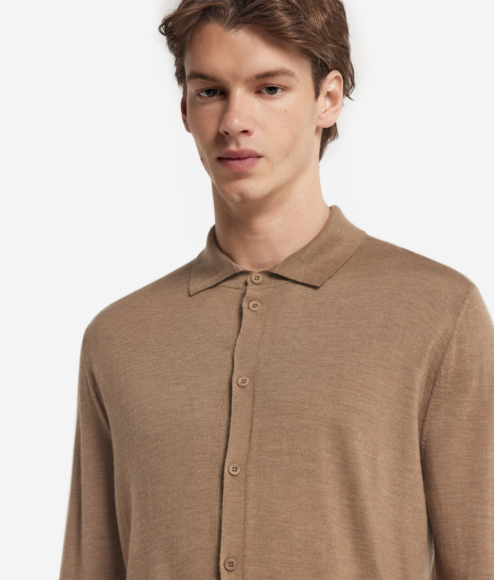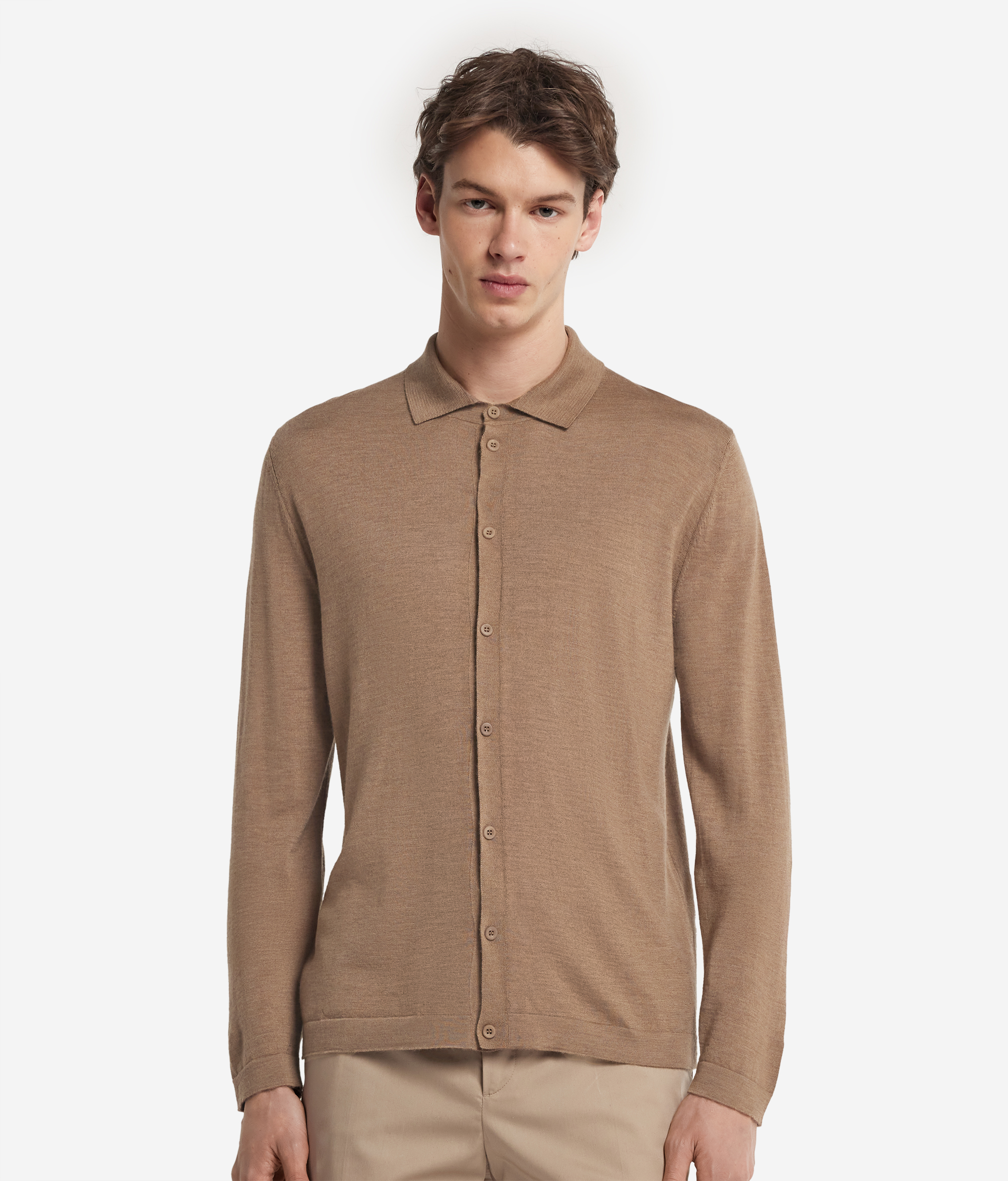 Рубашка из ультратонкого кашемира — универсальный и элегантный предмет мужского гардероба на все времена. Длинные рукава и мягкий трикотажный воротник создают ощущение уюта и непринужденности, великолепно дополняя комфортный непринужденный образ. Центральная пуговичная застёжка добавляет практичности и изысканности, а стандартный крой обеспечивает мягкий гармоничный силуэт.