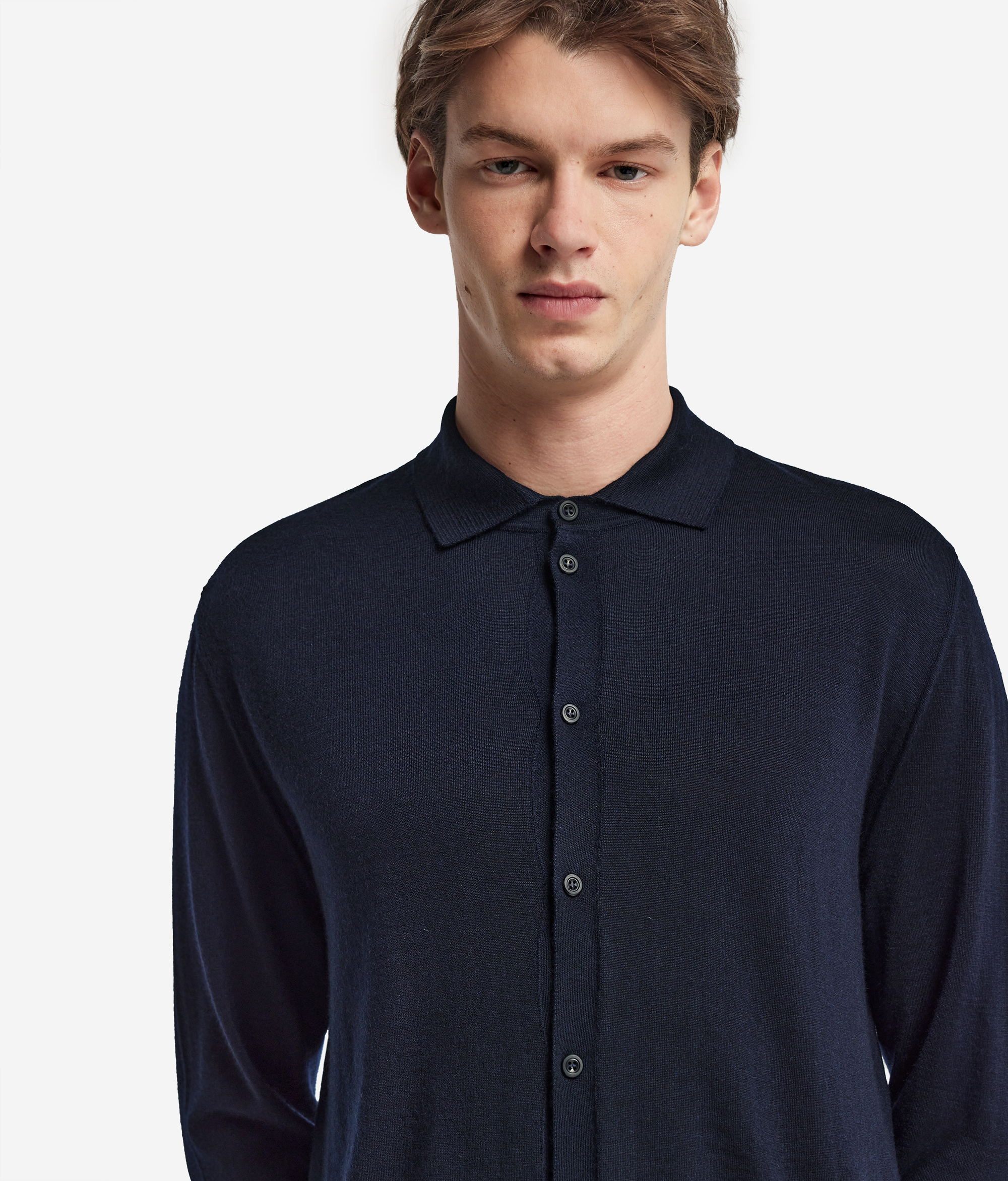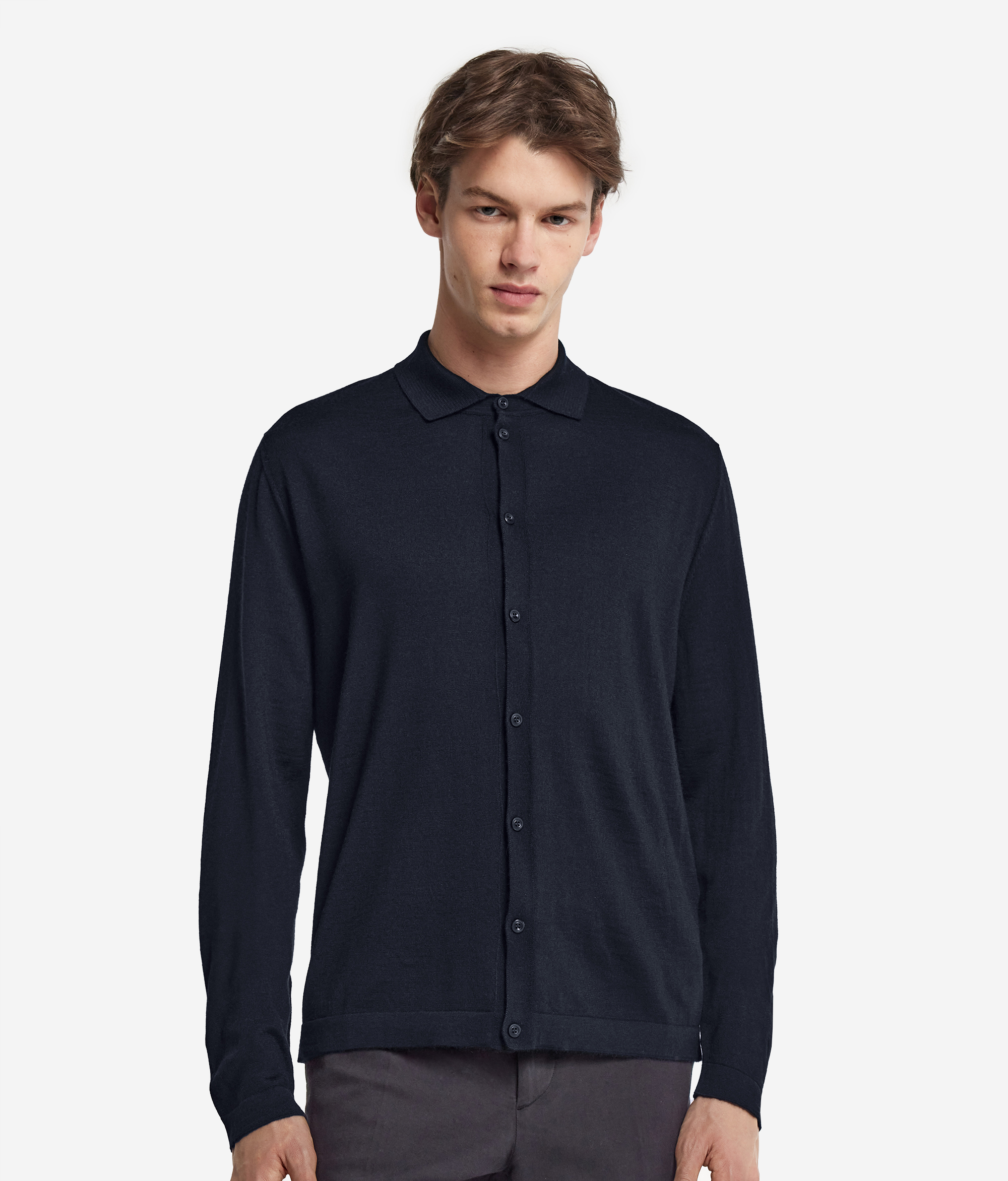 Рубашка из ультратонкого кашемира — универсальный и элегантный предмет мужского гардероба на все времена. Длинные рукава и мягкий трикотажный воротник создают ощущение уюта и непринужденности, великолепно дополняя комфортный непринужденный образ. Центральная пуговичная застёжка добавляет практичности и изысканности, а стандартный крой обеспечивает мягкий гармоничный силуэт.