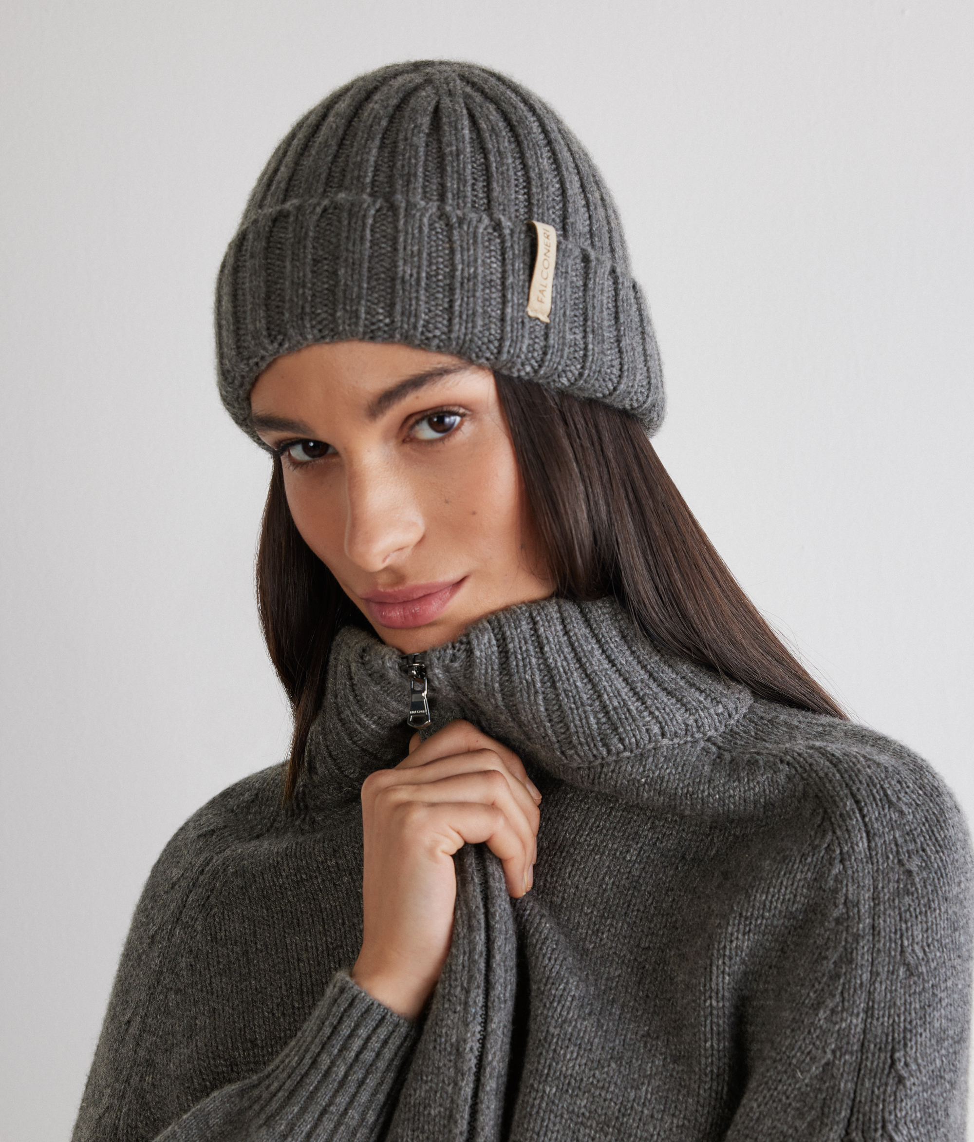 Эта шапка из кашемира отличается особой изысканностью за счёт таких деталей, как подкладка из шёлка и отделка в рубчик, которые придают ей обволакивающую мягкость. Она станет незаменимым аксессуаром в зимнем гардеробе и будет согревать вас даже в суровые морозы.