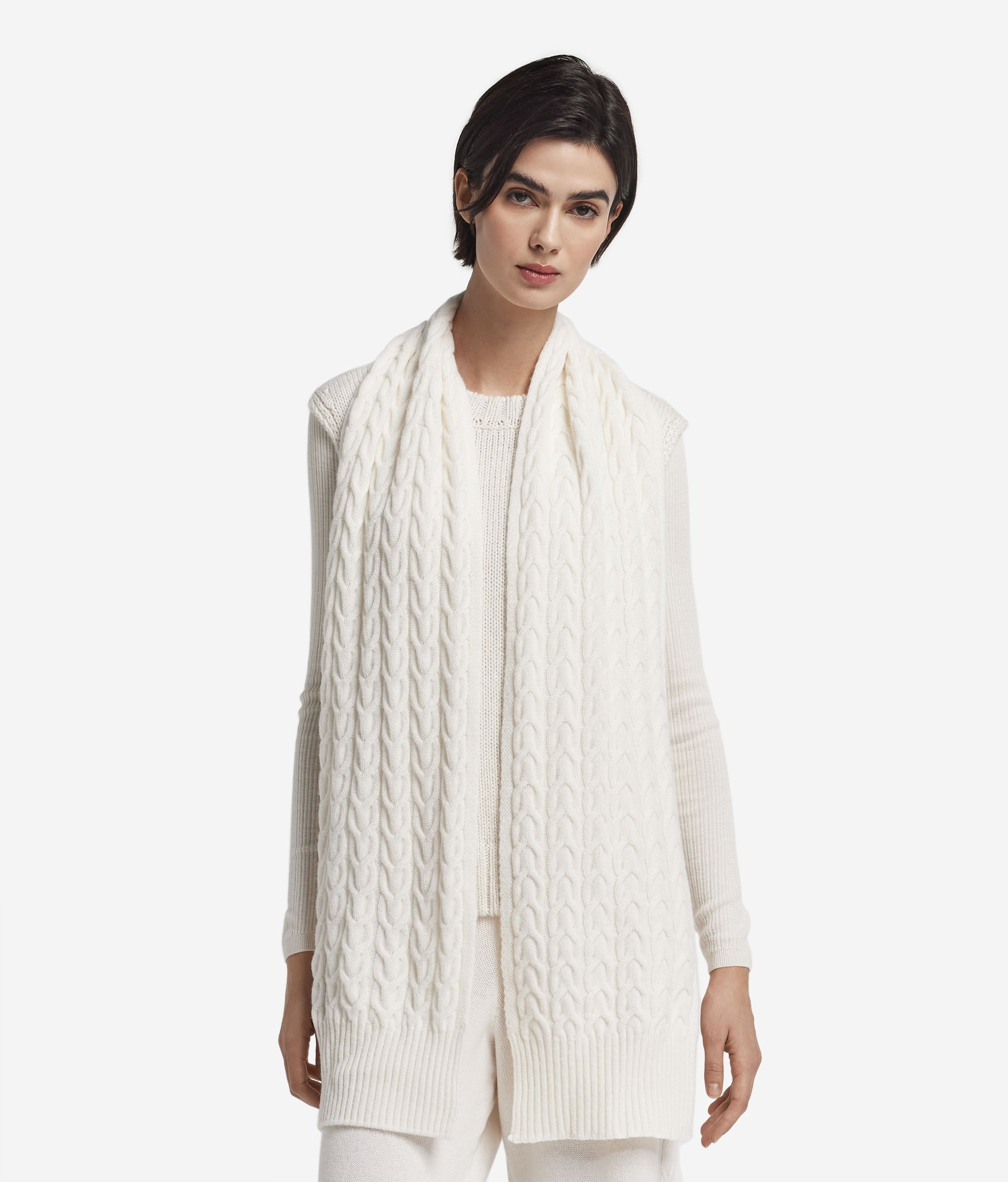 Этот шарф, изготовленный из благородного ультрамягкого кашемира, окутает вас непревзойденной нежностью и добавит стильный акцент любому образу. Вертикальный узор «косичка» оживляет фактуру, а резинка по низу мягко очерчивает контуры, придавая изделию завершённость и характер. Аксессуар вне времени для тех, кто выбирает комфорт и элегантность в любых обстоятельствах.