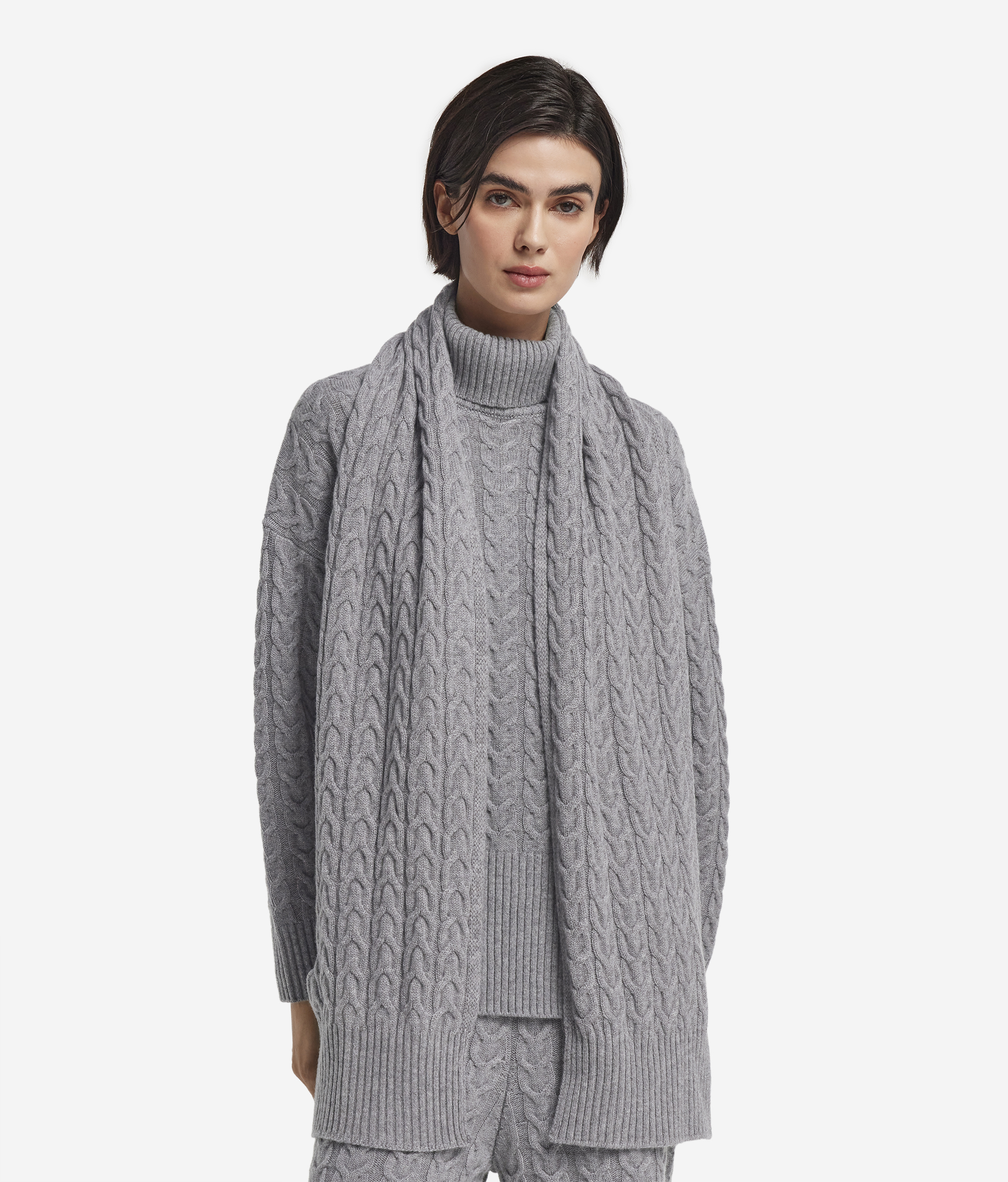 Этот шарф, изготовленный из благородного ультрамягкого кашемира, окутает вас непревзойденной нежностью и добавит стильный акцент любому образу. Вертикальный узор «косичка» оживляет фактуру, а резинка по низу мягко очерчивает контуры, придавая изделию завершённость и характер. Аксессуар вне времени для тех, кто выбирает комфорт и элегантность в любых обстоятельствах.