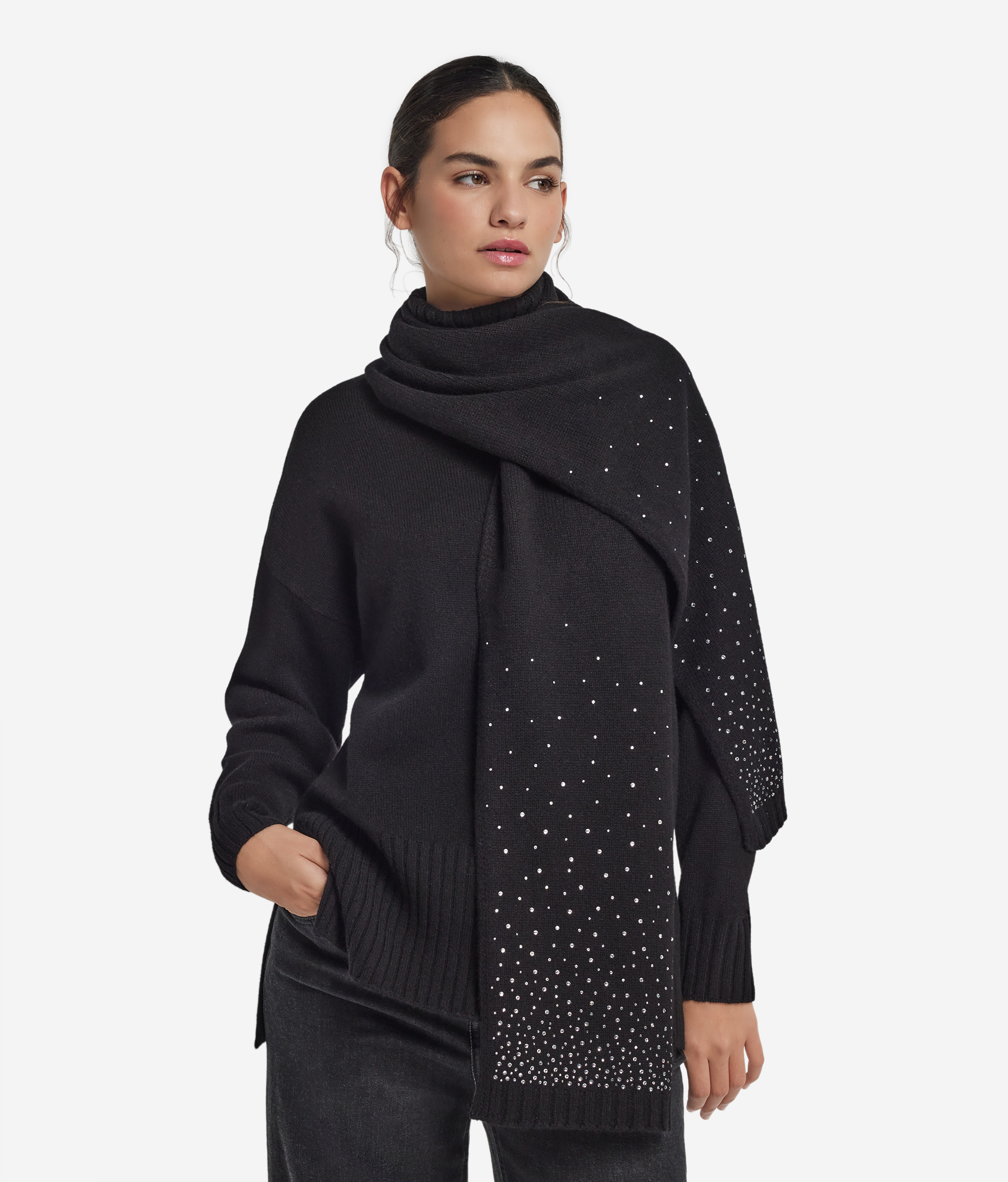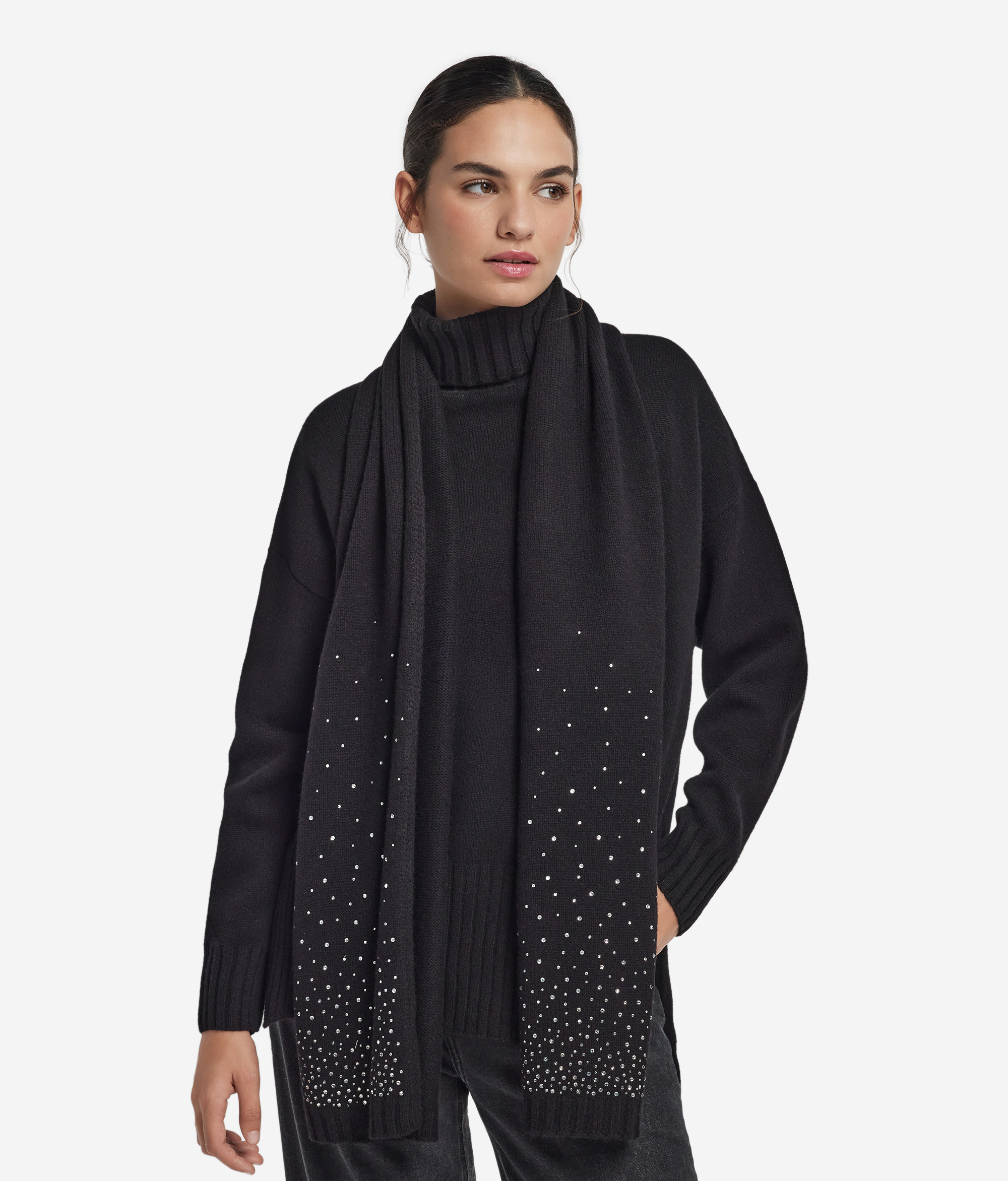 Этот роскошный и уютный шарф из ультрамягкого кашемира — идеальный аксессуар, который подарит тепло и защиту от зимнего холода. Неповторимую изысканность и сверкающий акцент придаёт этой модели элегантная отделка блестящими стразами с эффектом деграде на концах.
