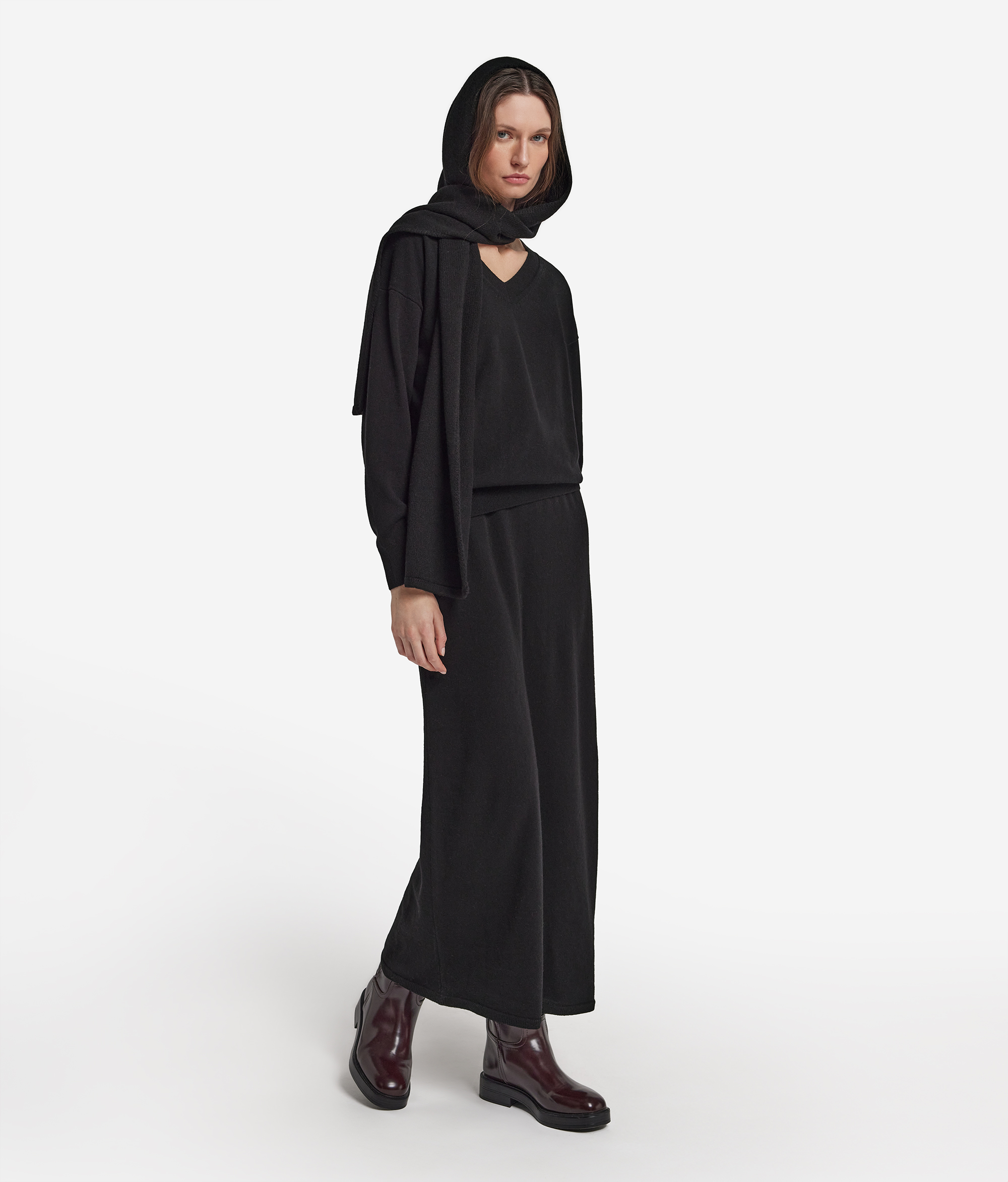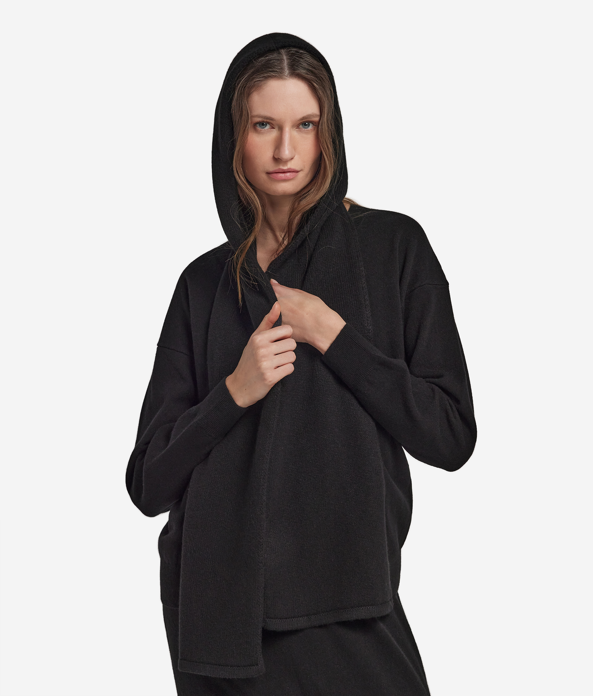 Незаменимая деталь современного гардероба, этот шарф из благородного ультрамягкого кашемира дарит необычайный комфорт, нежно касаясь кожи и согревая своим теплом. Капюшон, встроенный в дизайн, подчёркивает плавность движений и добавляет выразительный акцент любому образу. Изысканная отделка в рубчик свидетельствует о тонком мастерстве исполнения, превращая эту модель в ключевой элемент стиля — вне моды и времени.