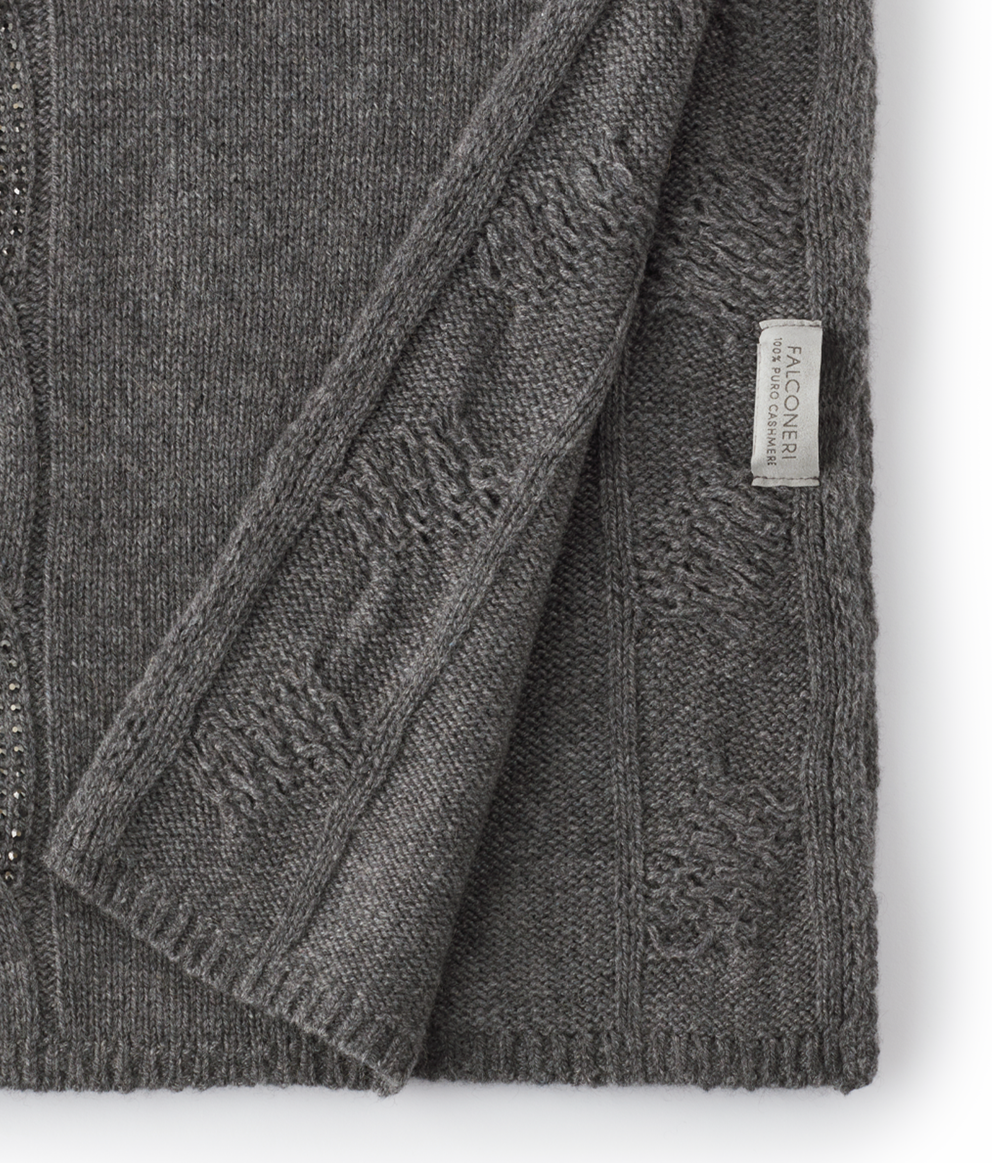 Этот шарф из нежнейшего ультрамягкого кашемира пленяет утончённостью, проявляющейся в каждой детали. Вертикальный узор «косичка» по краям придаёт фактуре глубину, а мерцание стразов наполняет изделие деликатным светом. Отделка в рубчик по краям подчёркивает форму, превращая этот аксессуар в идеальный акцент как для повседневных, так и для более элегантных сочетаний.