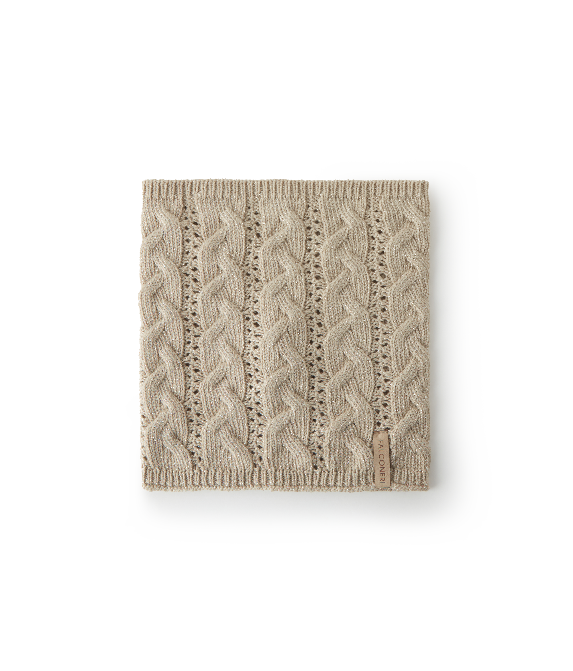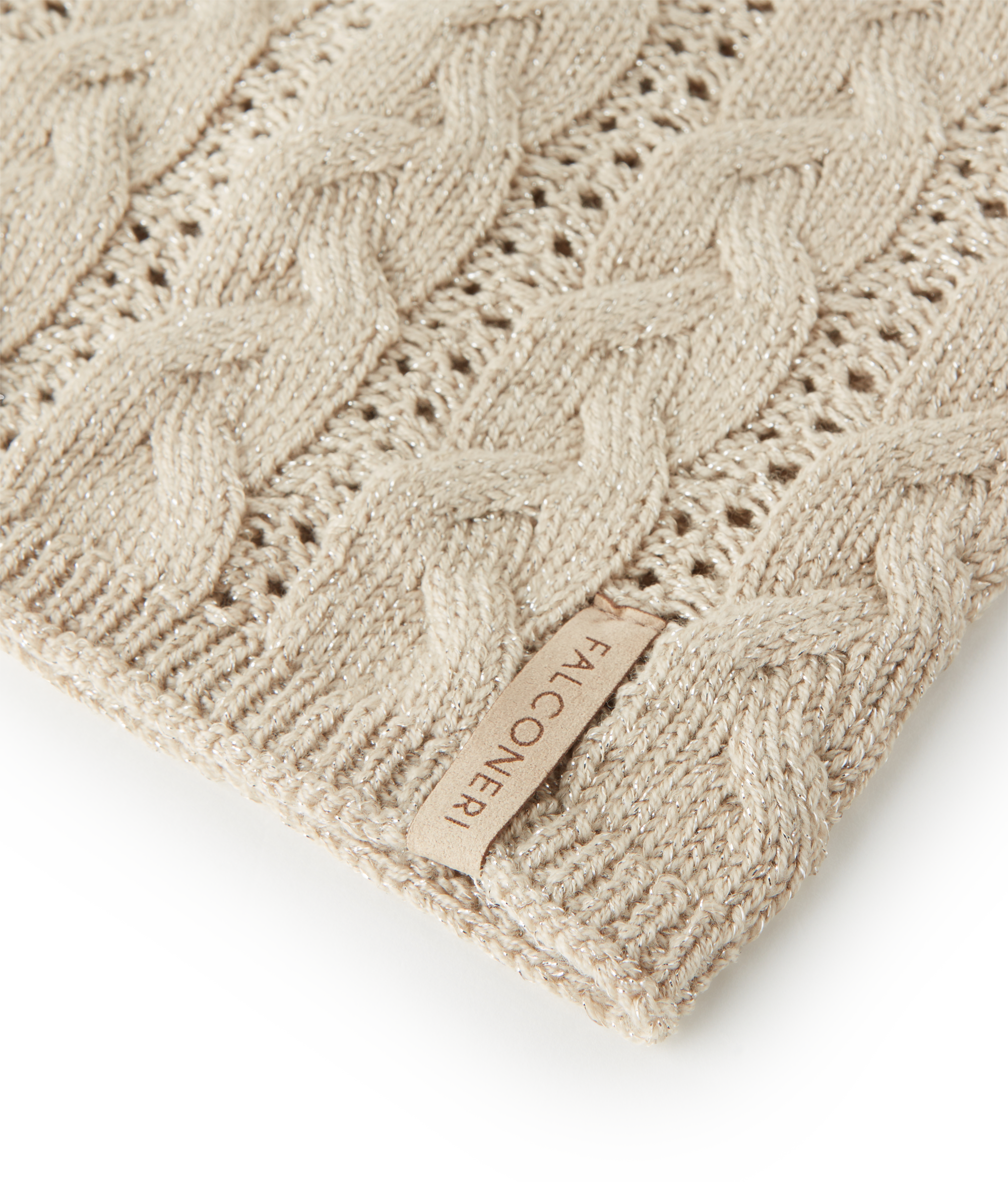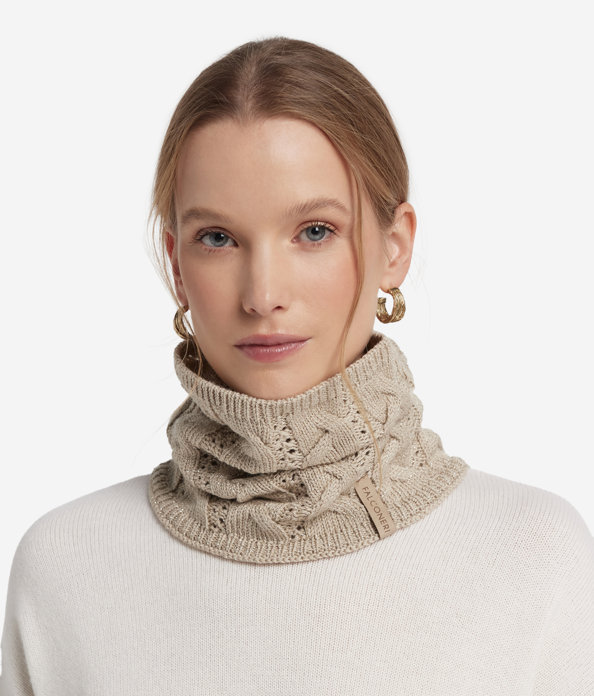 Аксессуар, в котором тепло встречается со стилем: шарф-снуд из шерсти с люрексовой нитью излучает деликатный блеск, а ажурная вязка и узор «косичка» придают ему глубину и выразительность. Элегантный и современный, он внесёт нотку роскоши в любой зимний гардероб.