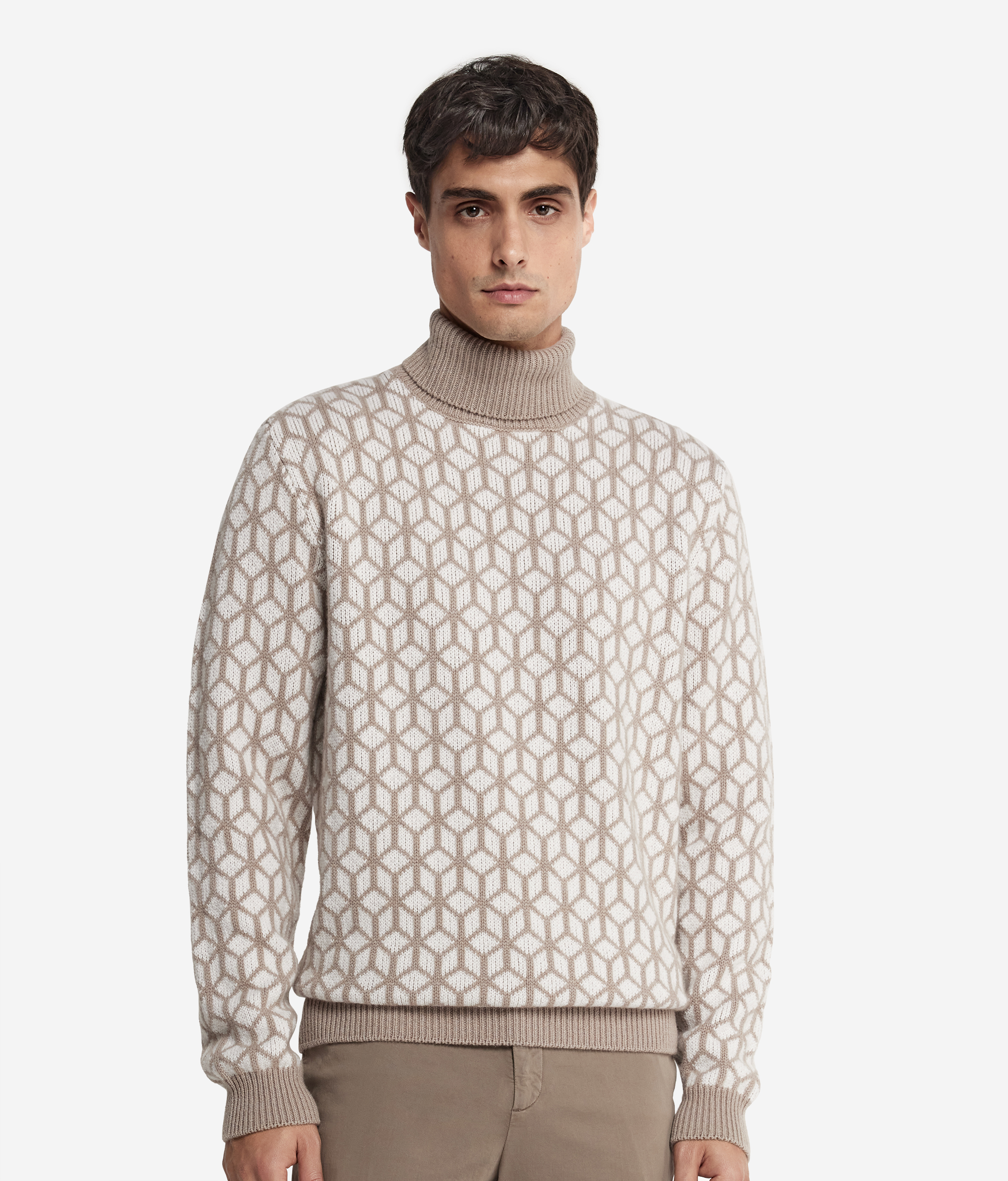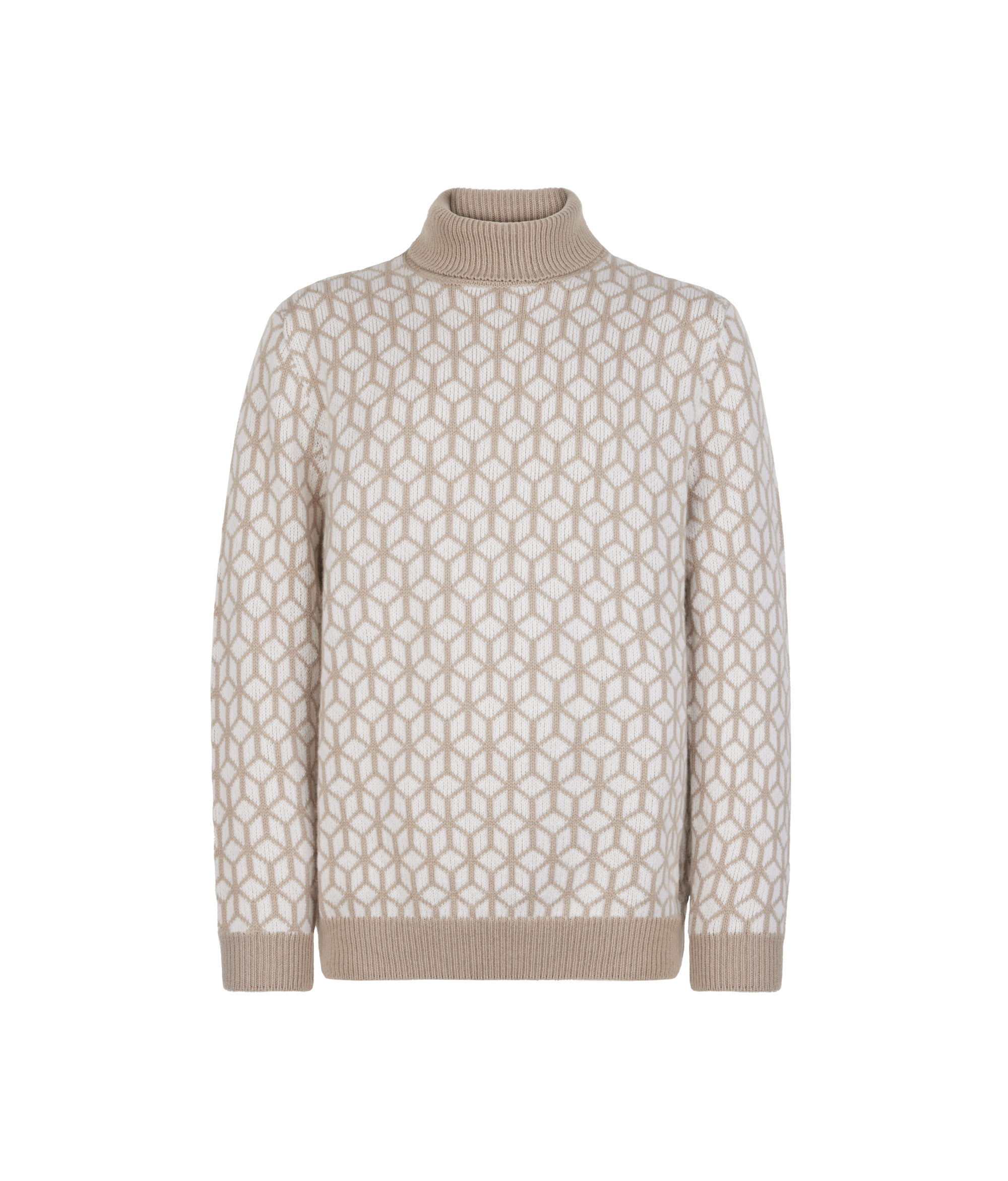 Эта двухцветная водолазка из роскошного ультрамягкого кашемира с оптическим жаккардовым узором притягивает взгляды своим утончённым и современным дизайном. Изысканный контраст составляют однотонные манжеты, воротник и нижняя кайма в рубчик. Оригинальный рисунок, образованный переплетением нитей, подчёркивает качество исполнения изделия.