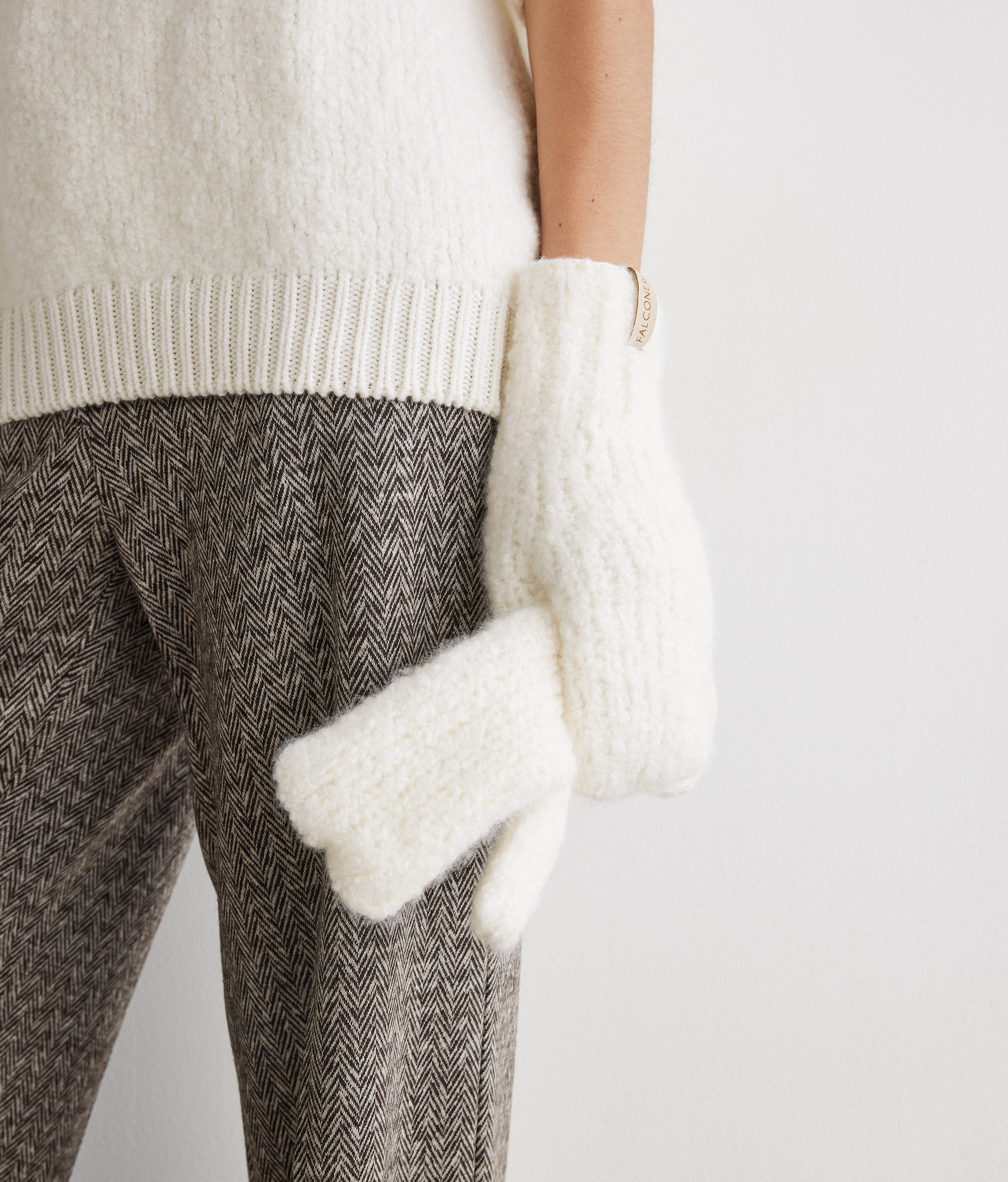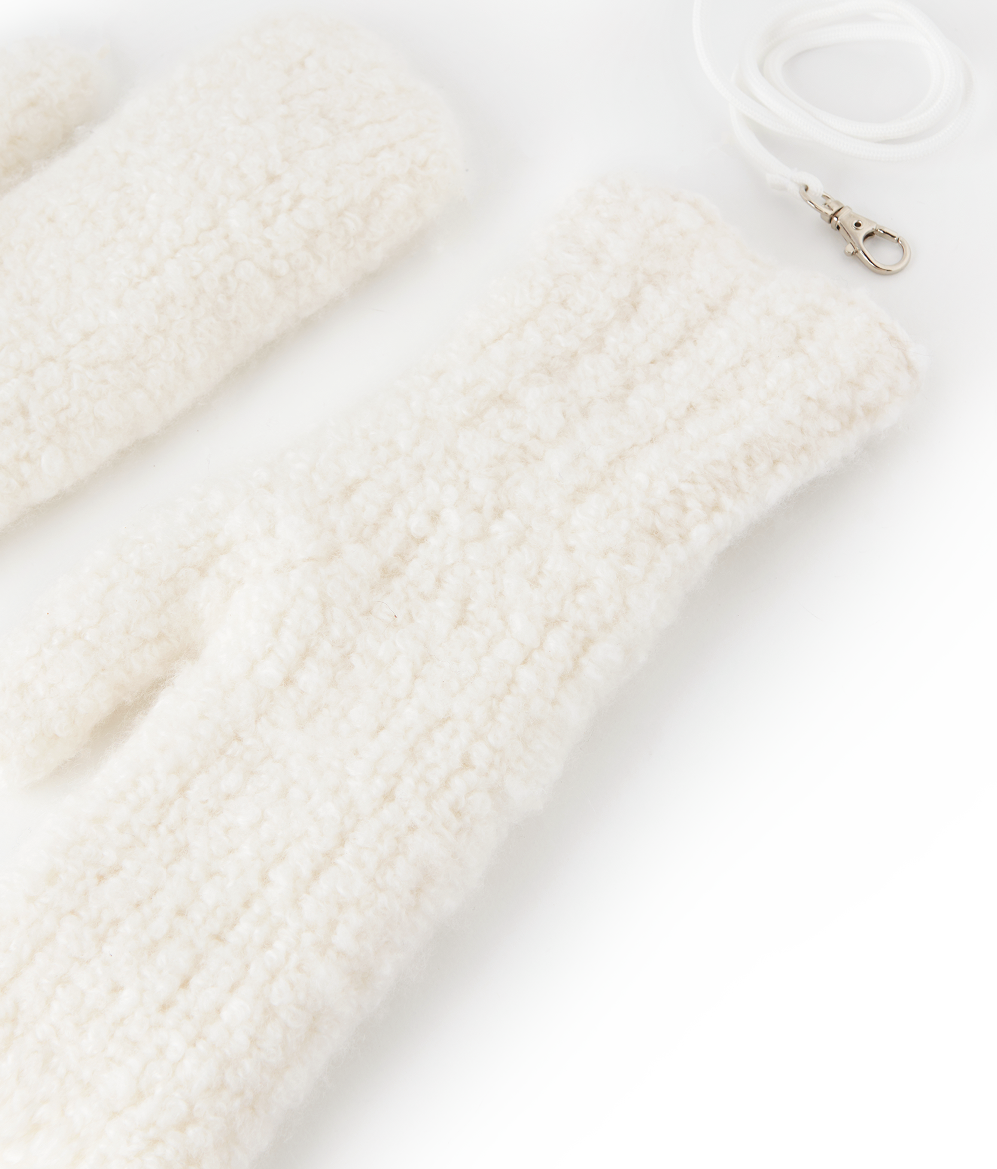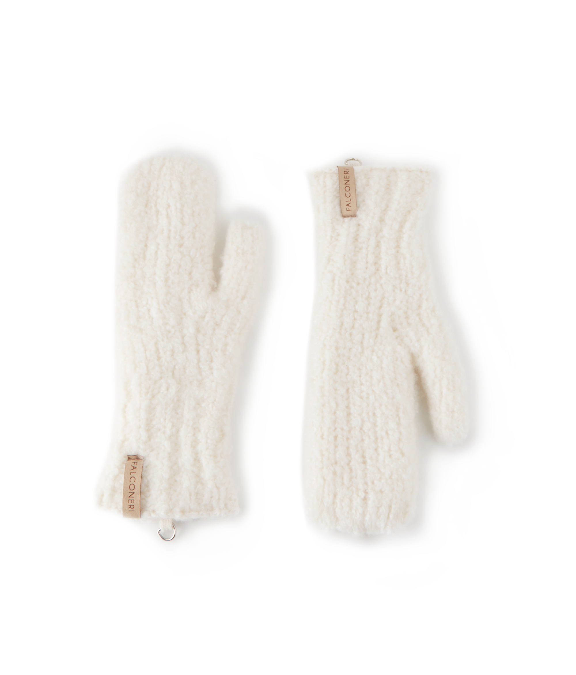Эти варежки воплощают гармонию комфорта и стиля: изнутри — гладкий ультрамягкий кашемир, окутывающий руки теплом и лёгкостью, снаружи — трикотаж букле, придающий образу выразительный акцент. Лаконичные металлические кольца и шнурок с карабинами добавляют аксессуару функциональности, делая его стильным и универсальным дополнением к зимнему гардеробу.