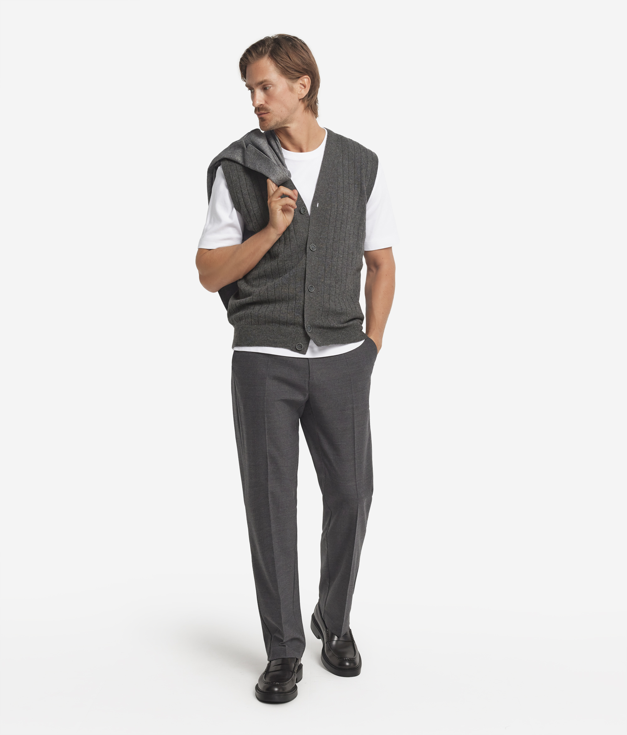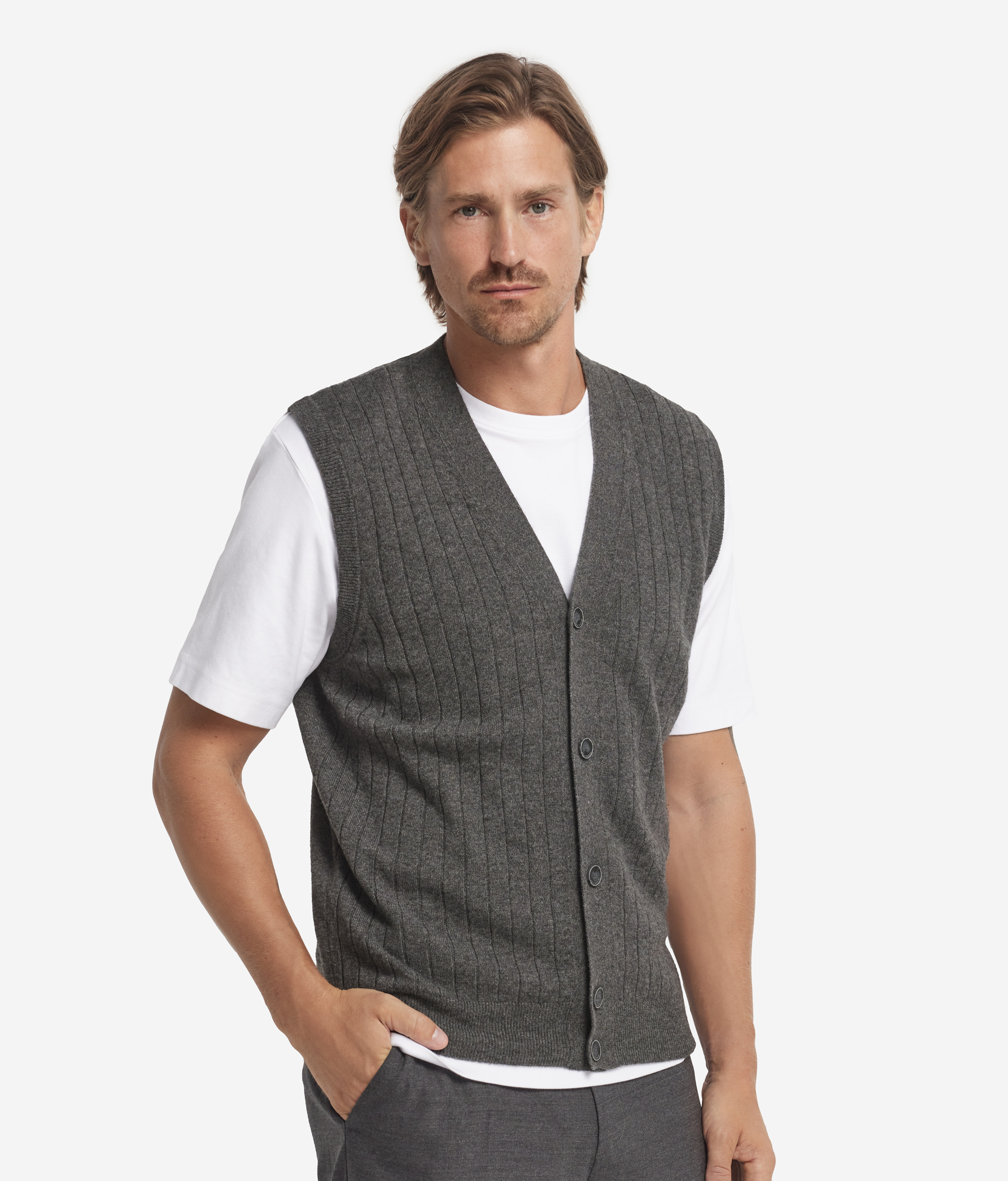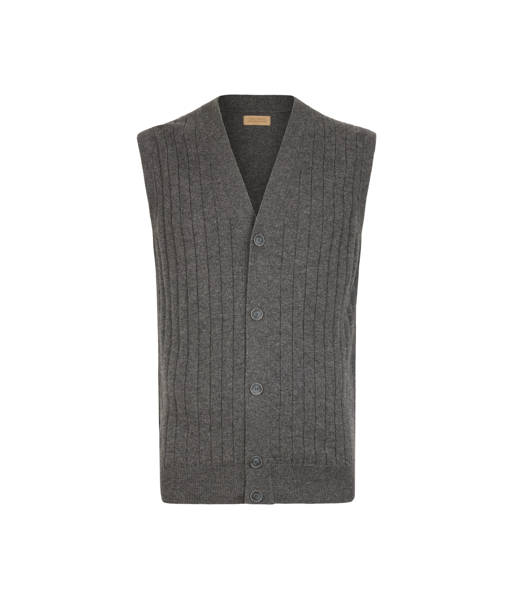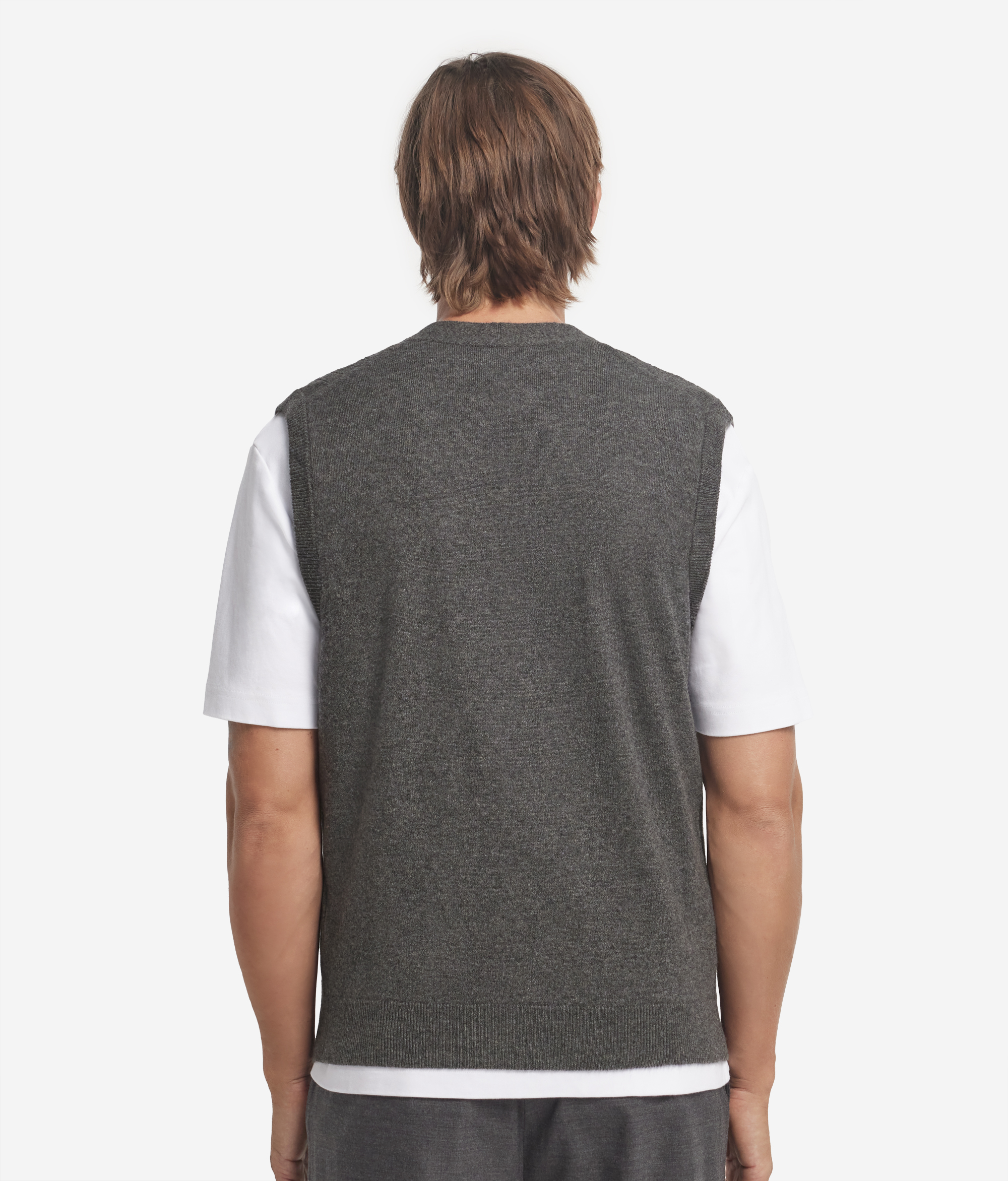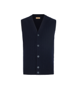 Этот жилет выполнен из ультрамягкого кашемира высшего качества, который дарит коже ощущение нежности и воздушного тепла. Графичная и утончённая отделка в рубчик добавляет фактурности и визуальной глубины, подчёркивая естественный блеск пряжи. Модель без рукавов с V-образным вырезом горловины дополнена центральной планкой на пуговицах — элегантная деталь, придающая силуэту сдержанность и чистоту.